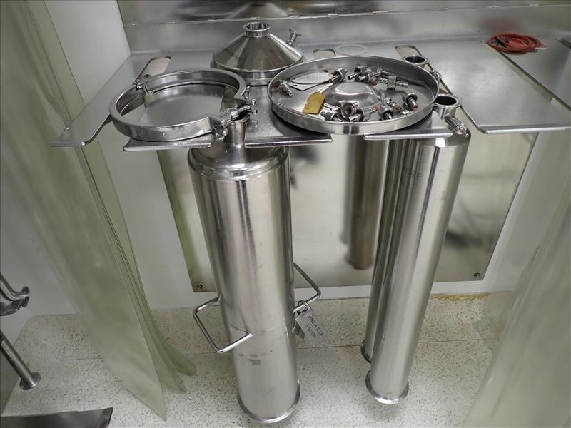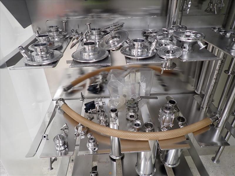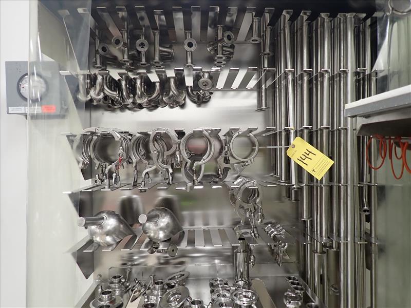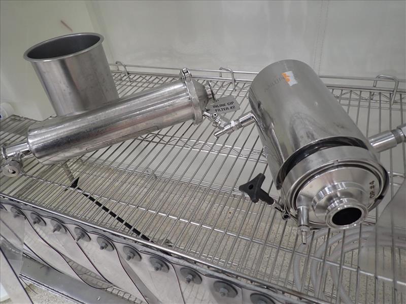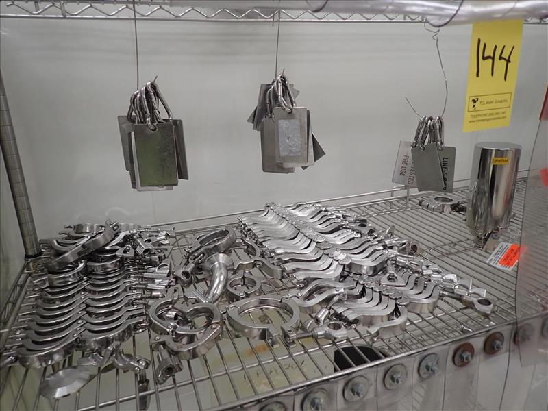 s/s pipe fittings, incl. misc. lengths of bridge piping, directional fittings, pipe clamps, filter housings, etc. c/w storage units
