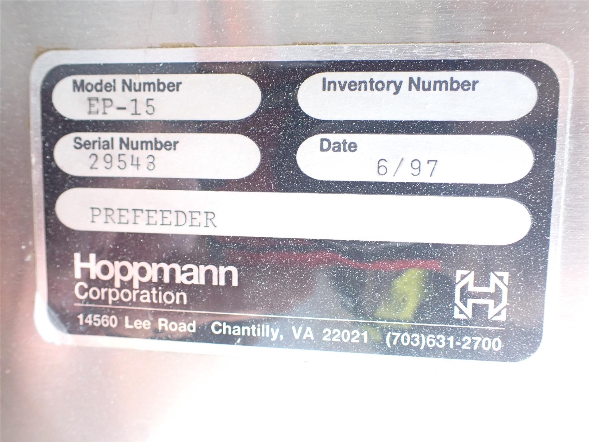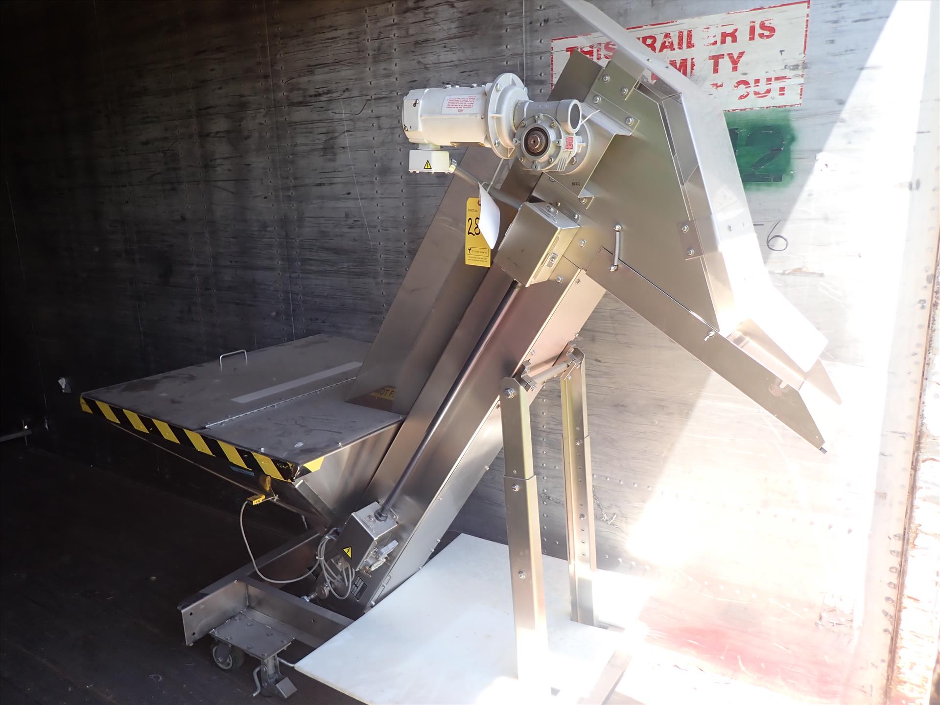 Hoppmann bottle hopper elevator, mod. EP-15, ser. no. 29543, s/s, 8 in. fluted belt, approx. 39 in. x 42 in. hopper, on casters