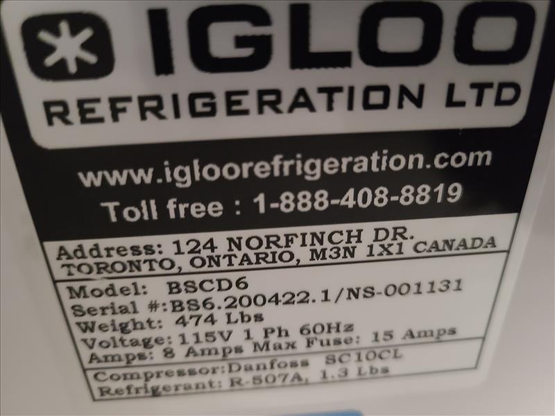 Igloo Curved Glass Refrigerated Display Case, model BSCD6, S/N. BS6.200422.1, 78 in. x 46 in. x 48 in. H, 474lbs, 115V, 8amps, 1 Phase, 60Hz.