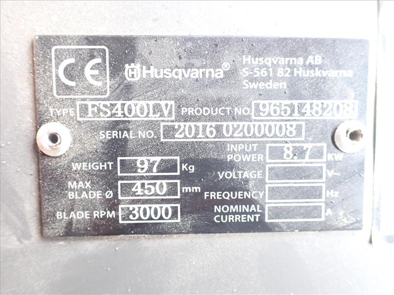 2016 Husqvarna Floor Saw, model FS400LV, S/N.20160200008, w/four stroke engine, 450mm max blade diameter, 3000rpm, adjustable handles, c/w (1) Husqvarna Diamond Blade