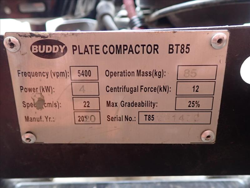 Buddy Gas-Powered Plate Compactor, model BT85, S/N.T85201470, w/4.8hp Honda GX160 engine, 5400 vpm, plate size 20 in. x 16 in.