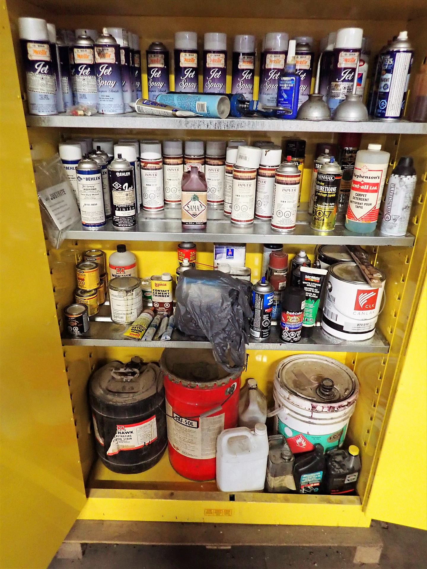 JustRite flammables cabinet, 45 gal. c/w contents: paints, etc.