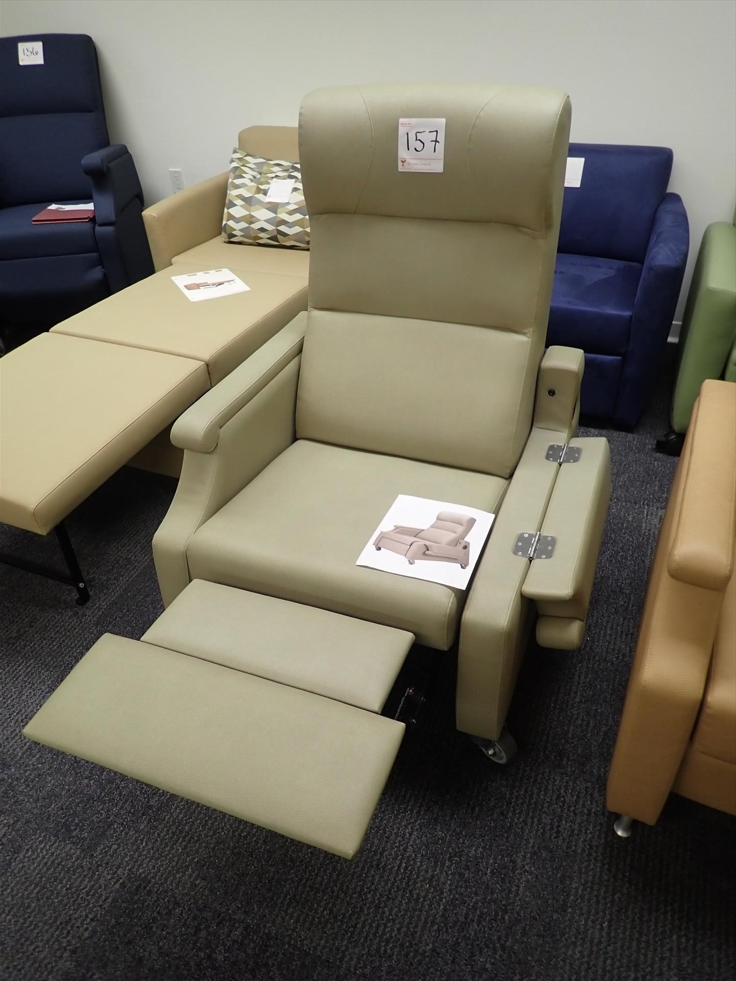 Denver recliner w/ patient transfer arm, finger-pull back, lever foot rest, castors, stain-resistant