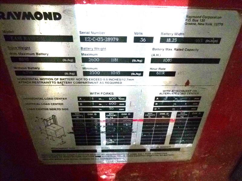 Raymond reach fork lift truck, mod. Easi R45TT-M, ser. no. EZ-C-03-28979, 4500 lbs cap., 36V