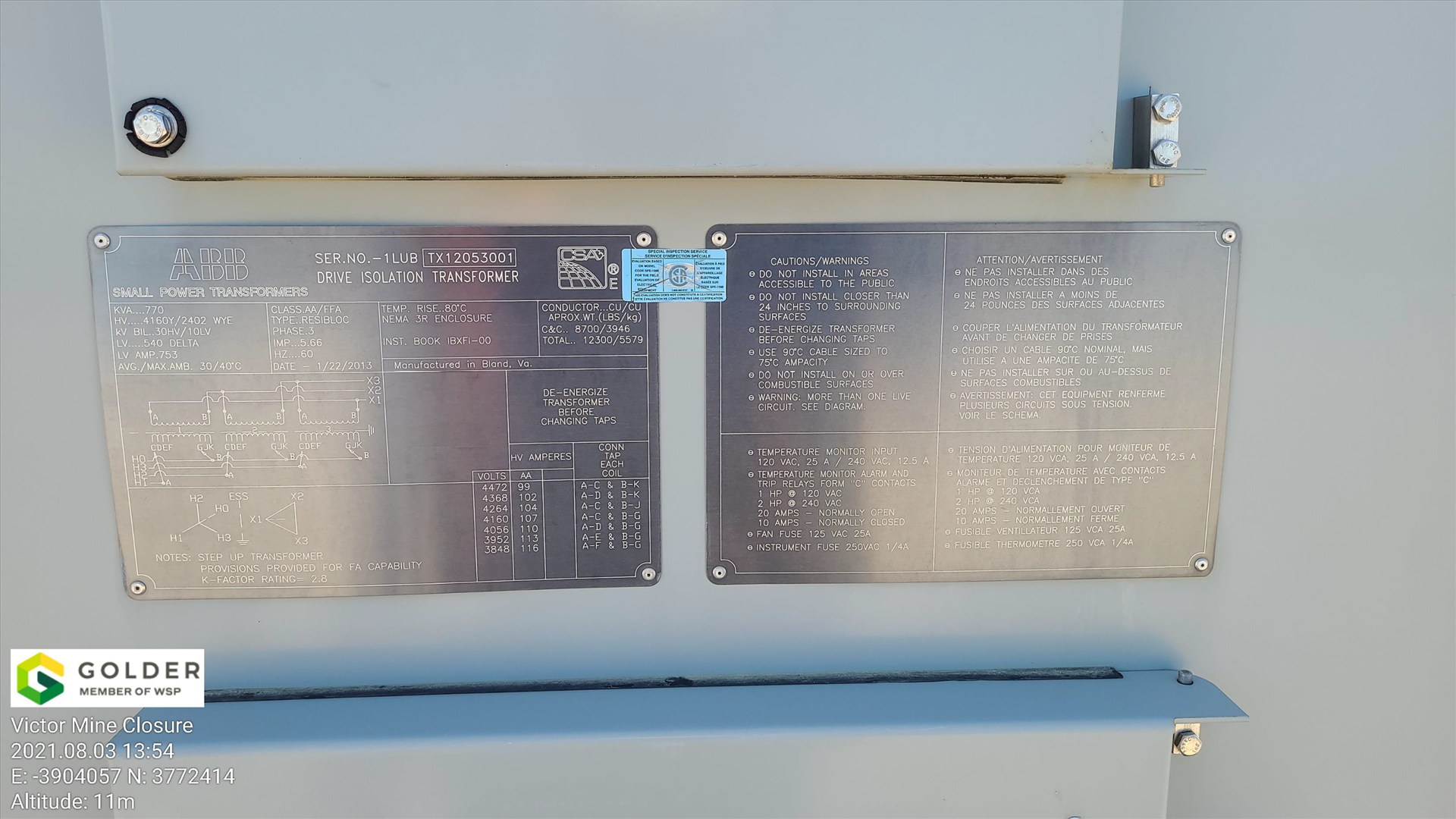 ABB Drive Isolation Transformer, ser. no. 1LUBTX12053001 (2013), 770 kva