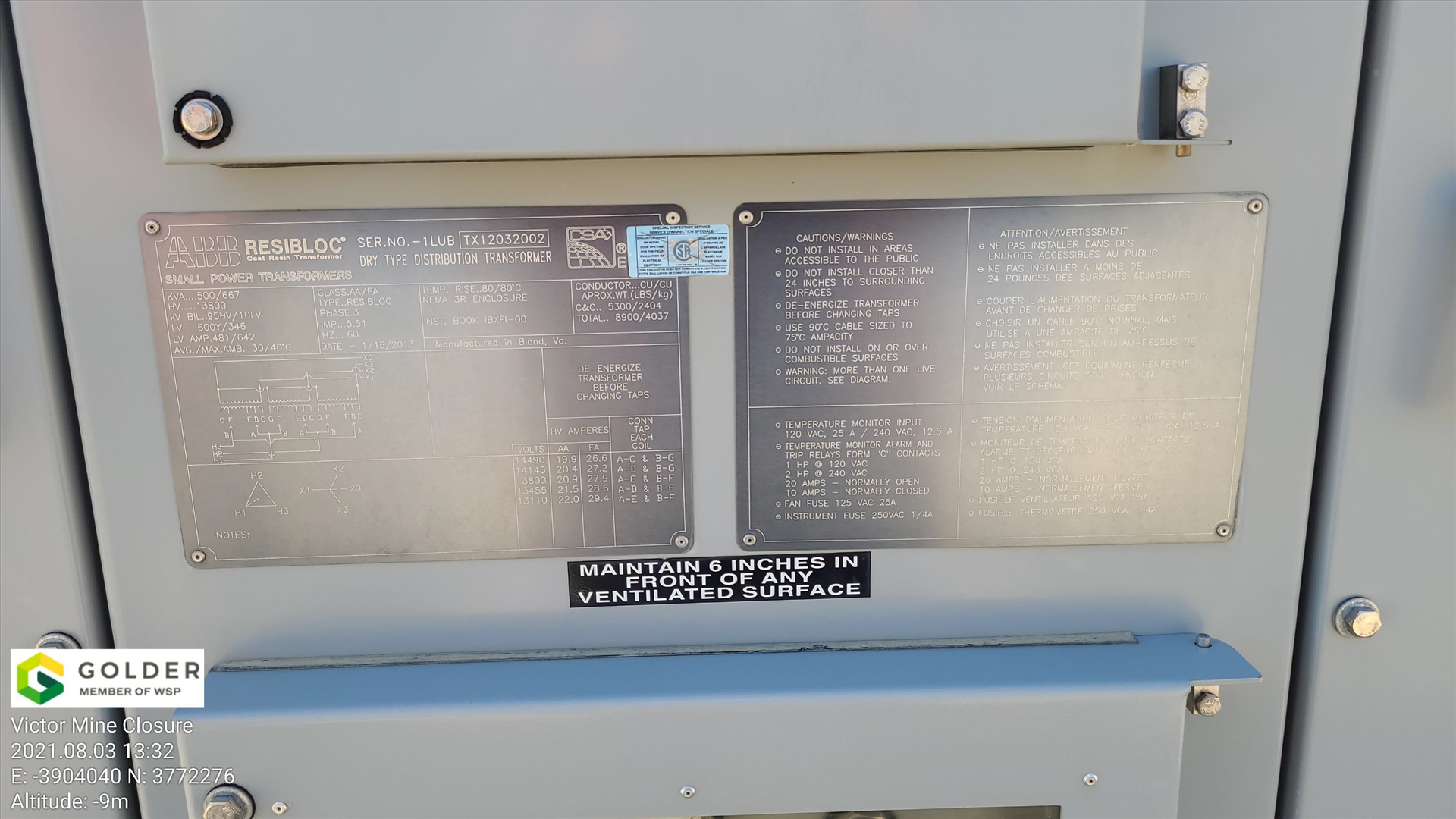 ABB Resibloc Dry Type Transformer, ser. no. 1LUBTX12032002, 500/667 kva
