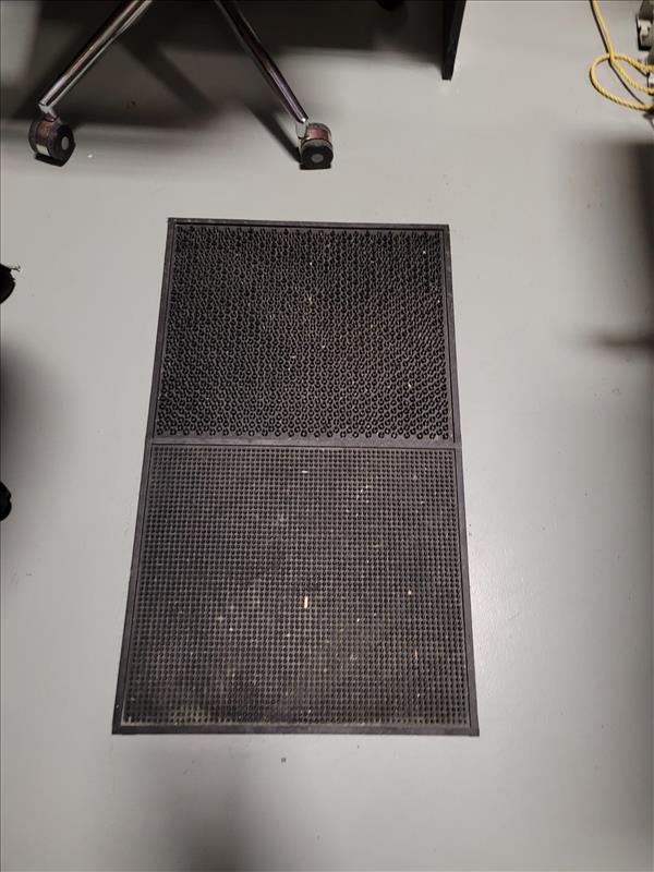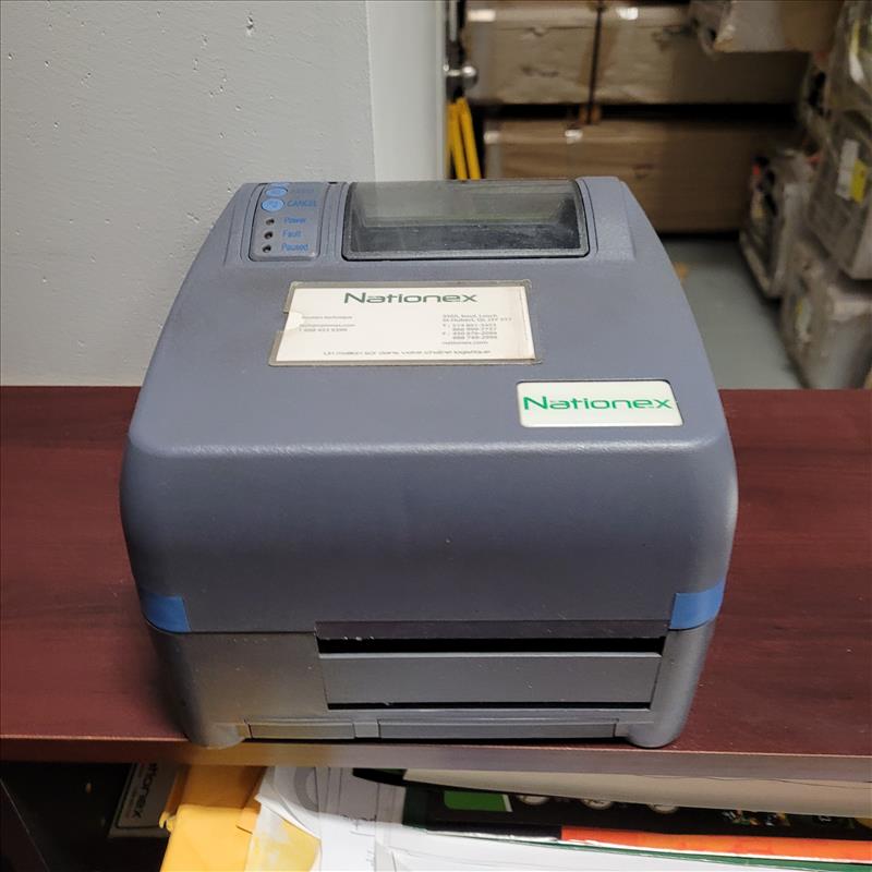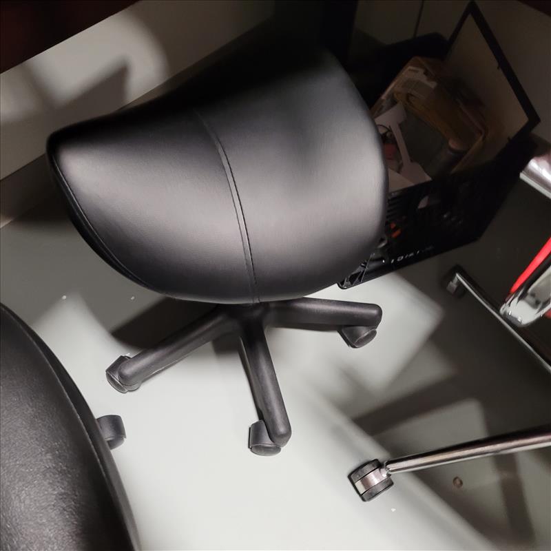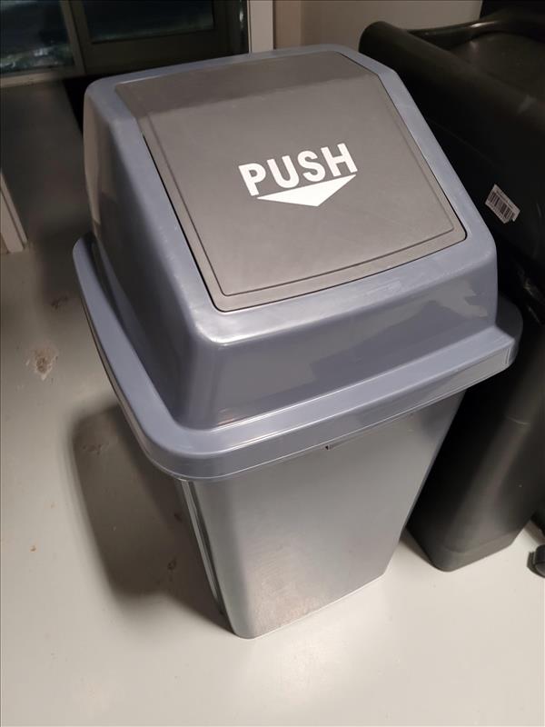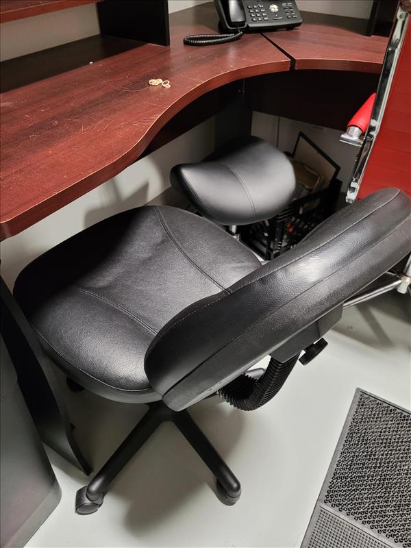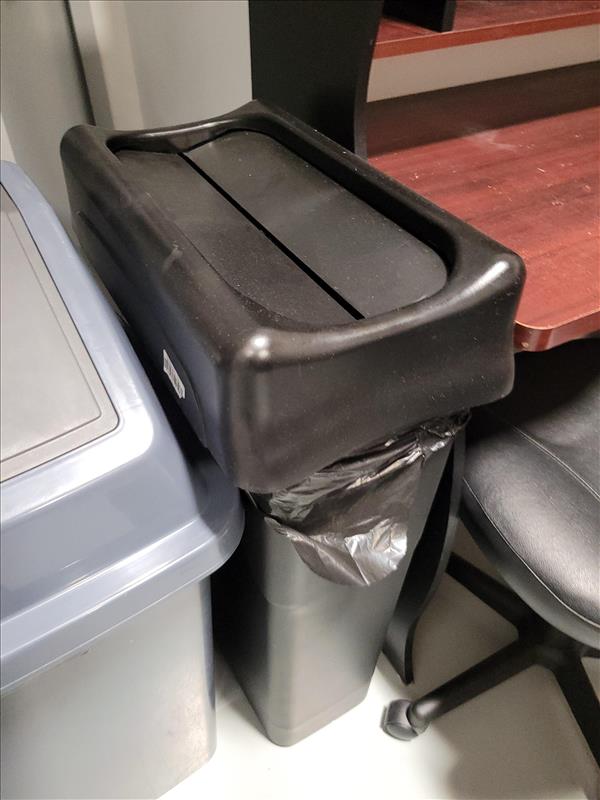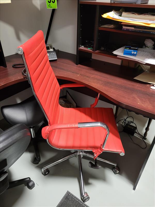 Contents of shipping office including: Industrial swing-top garbage bin, slim swing-lid garbage bin, L-Shape desk w/ cabinets and shelves, adjustable office chair on wheels, plastic boot mat, leather operator stool, NATIONEX printer, Red operator chair with wheeled base
