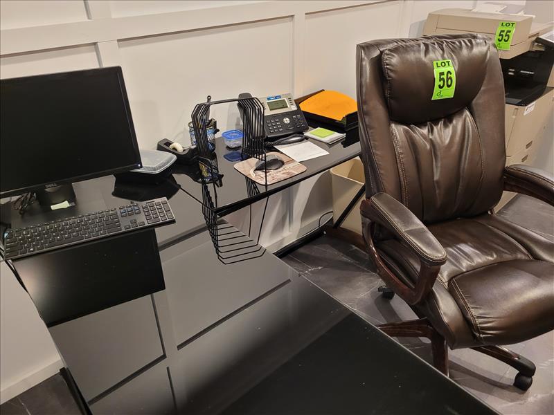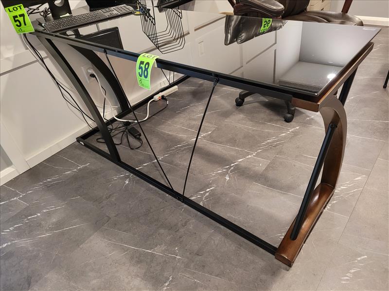 L-shape glass, steel and wood office desk 62in L x 42in L, 30in H x 20in W