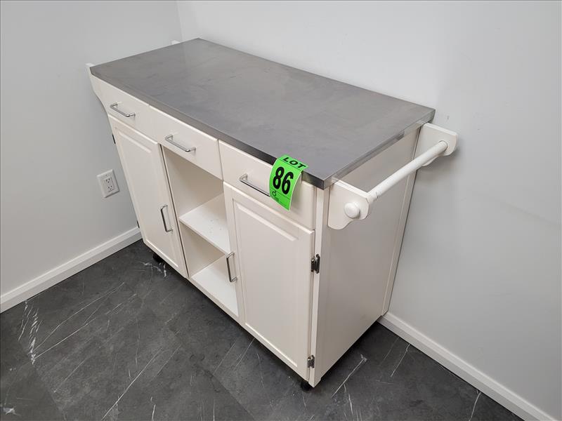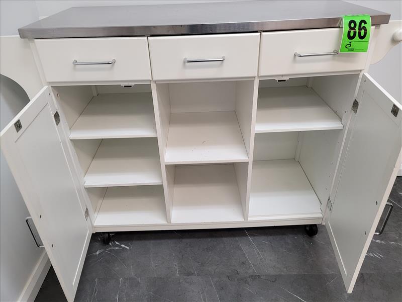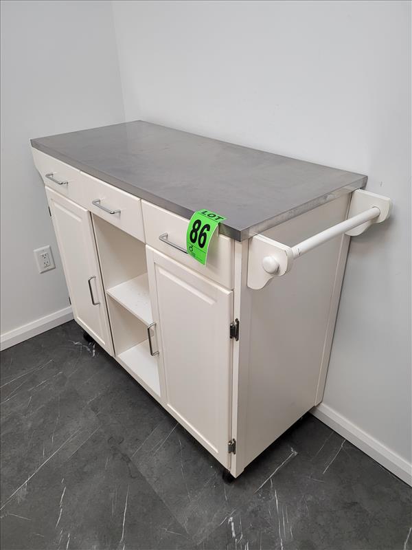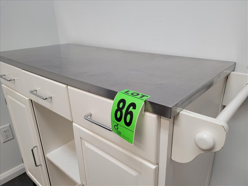 CROSLEY rolling kitchen island with stainless steel top in white finish 55in x 22in W x 37in H