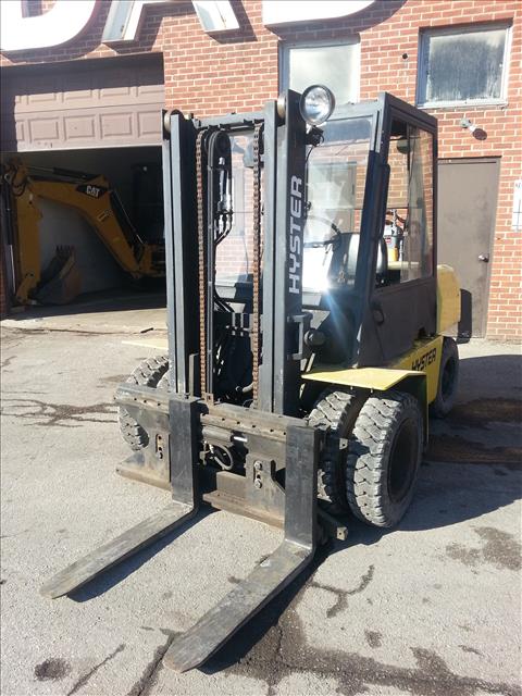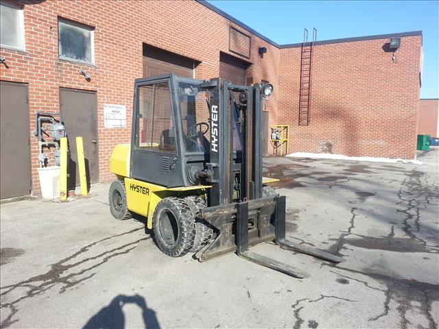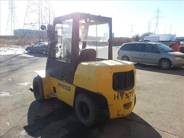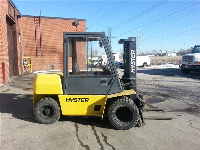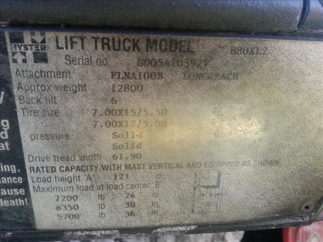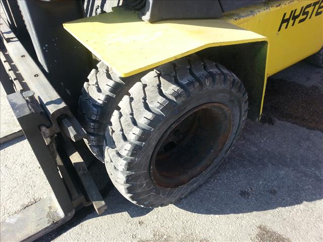 1998 Hyster H80XL2 Fork Lift (Yard) Truck, 8000 lbs. cap., hour meter displays 3527 hrs., diesel, 2-stage mast, side-shift, lever controls, enclosed cab, outdoor tires, dual front tires, ser. no. G005A10592V