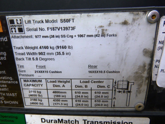 2008 Hyster S50FT Fork Lift Truck, 4800 lbs. cap., hour meter displays 11457 hrs., propane, 3-stage mast, side-shift, finger controls, ser. no. F187V13973F