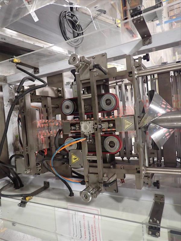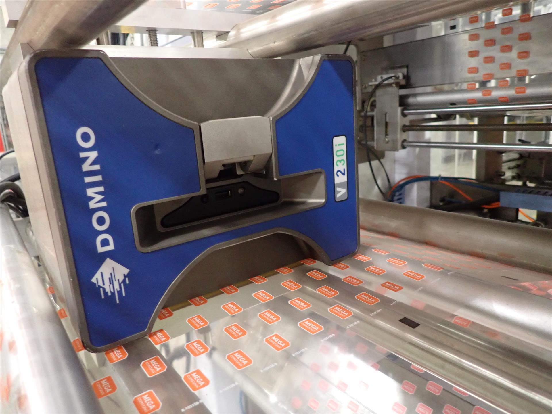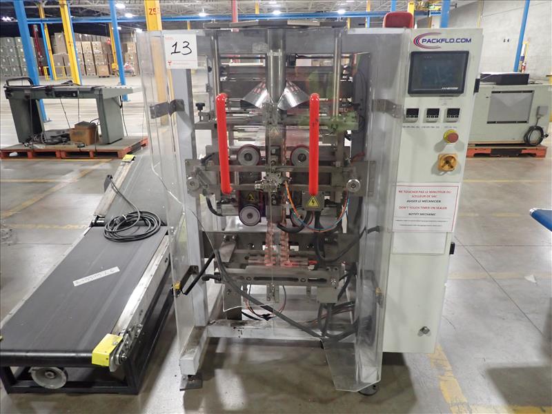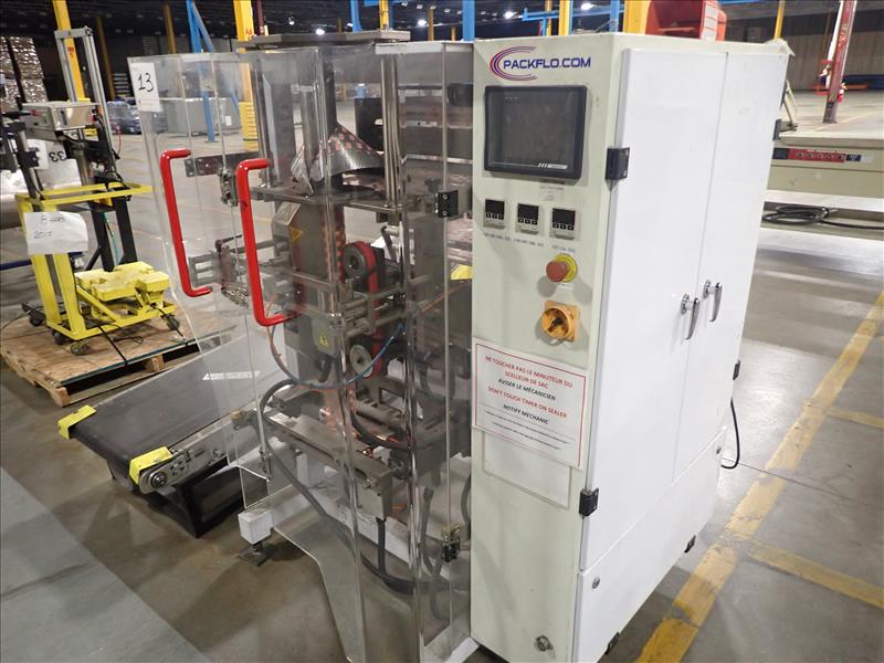 PackFlo vertical bagger form/fill/seal machine, ser. no. 20100802402AB, bag length 50-340 mm, bag width 80-260 mm c/w Domino V230i thermal transfer overprinter andelevated belt exit conveyor, 24 in. x 6.5 ft