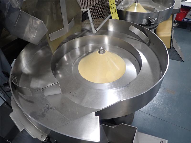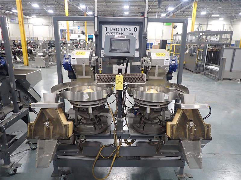 Batching Systems Inc. dual continuous counter, mod. BATCHMASTER IV, ser. no. BMIV-N-DA-042 w/ dual view scanners, dual fluted belt infeed conveyor, dual 24 in. vibratory bowl feeders, dual GATEBUDDY's, touch-screen controller and adj. hydraulic stand on casters