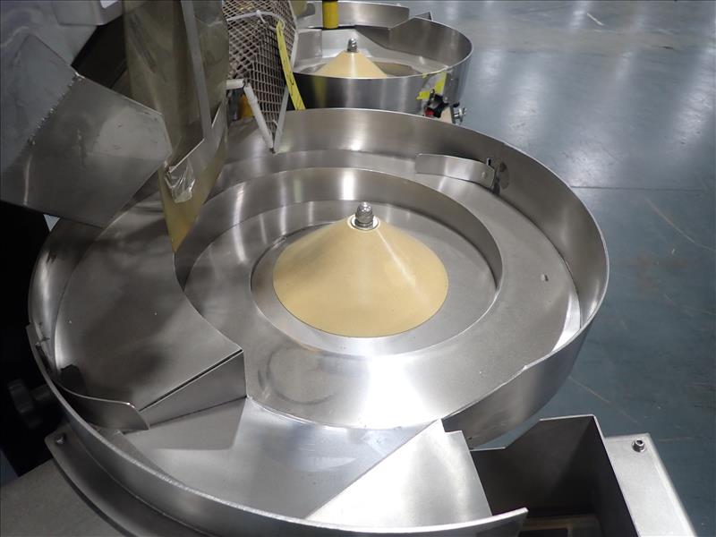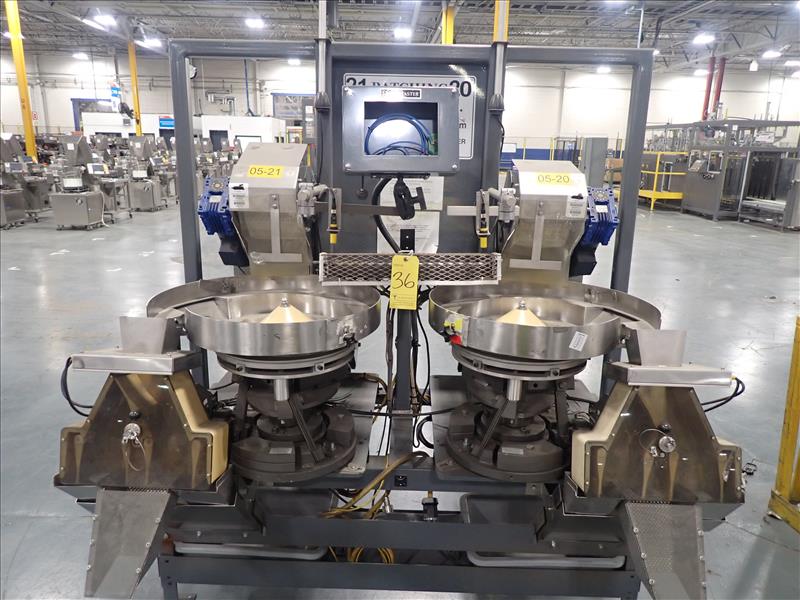 Batching Systems Inc. dual continuous counter, mod. BATCHMASTER IV, ser. no. BMIV-N-DA-040 w/ dual view scanners, dual fluted belt infeed conveyor, dual 24 in. vibratory bowl feeders, dual GATEBUDDY's, touch-screen controller and adj. hydraulic stand on casters