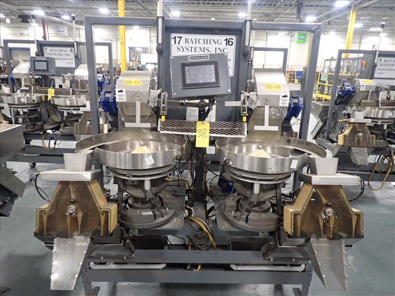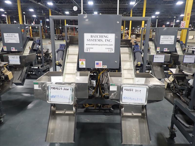 Batching Systems Inc. dual continuous counter, mod. BATCHMASTER IV, ser. no. BMIV-N-DA-039 w/ dual view scanners, dual fluted belt infeed conveyor, dual 24 in. vibratory bowl feeders, dual GATEBUDDY's, touch-screen controller and adj. hydraulic stand on casters