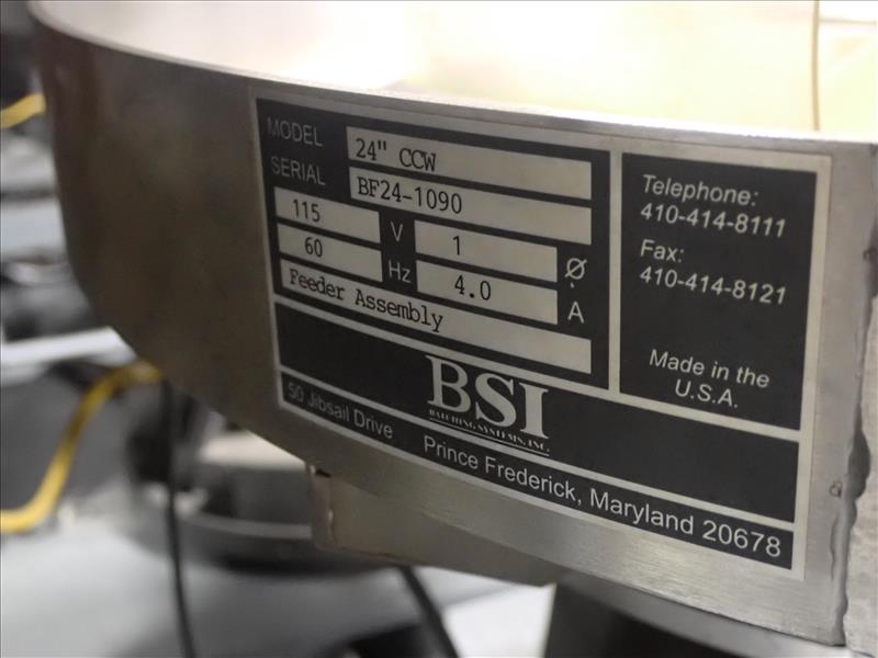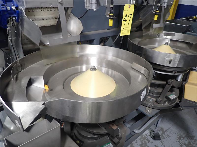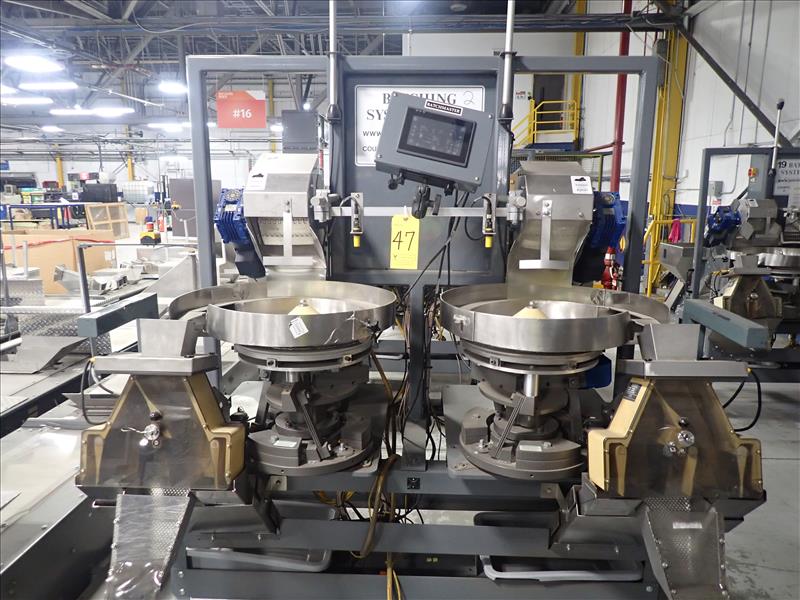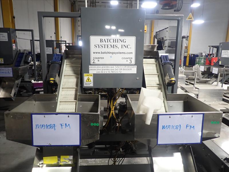 Batching Systems Inc. dual continuous counter, mod. BATCHMASTER IV, ser. no. BMIV-N-DA-047 w/ dual view scanners, dual fluted belt infeed conveyor, dual 24 in. vibratory bowl feeders, dual GATEBUDDY's, touch-screen controller and adj. hydraulic stand on casters