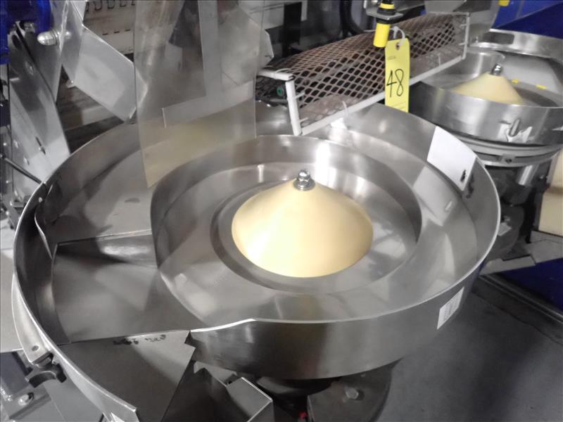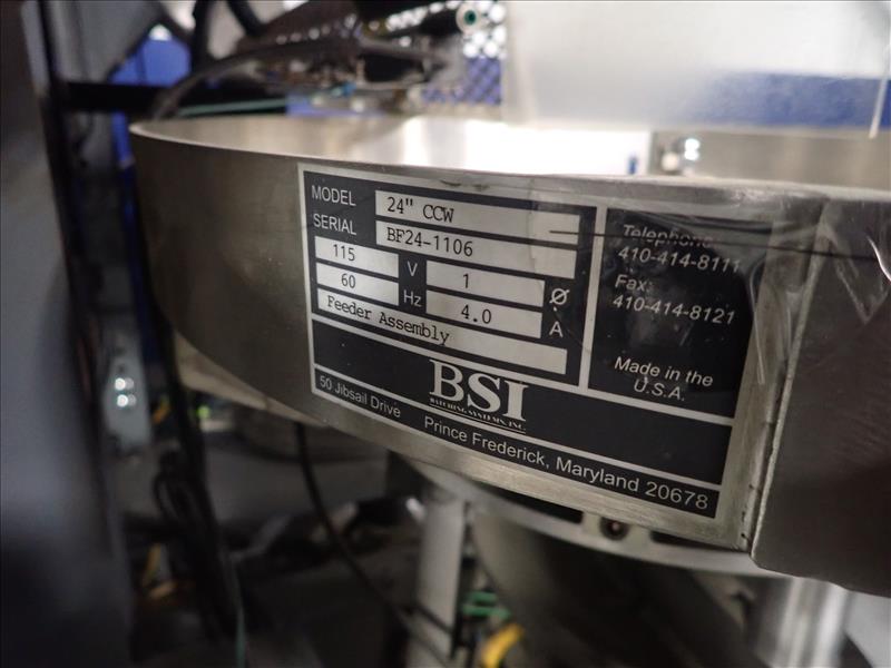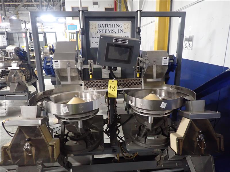 Batching Systems Inc. dual continuous counter, mod. BATCHMASTER IV, ser. no. BMIV-N-DA-046 w/ dual view scanners, dual fluted belt infeed conveyor, dual 24 in. vibratory bowl feeders, dual GATEBUDDY's, touch-screen controller and adj. hydraulic stand on casters