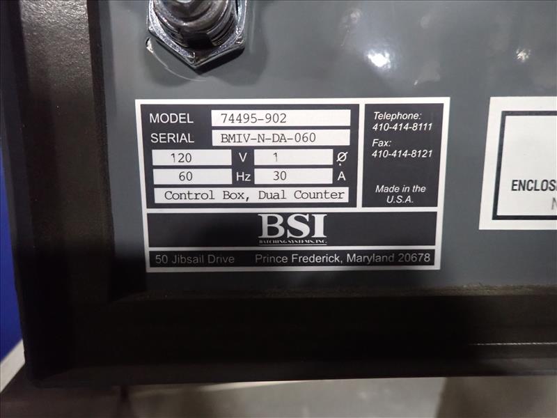 Batching Systems Inc. dual continuous counter, mod. BATCHMASTER IV DELUXE, ser. no. BMIV-N-DA-060 w/ dual view scanners, dual fluted belt infeed conveyor, dual 24 in. vibratory bowl feeders, dual GATEBUDDY's, touch-screen controller and adj. hydraulic stand on casters