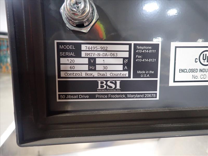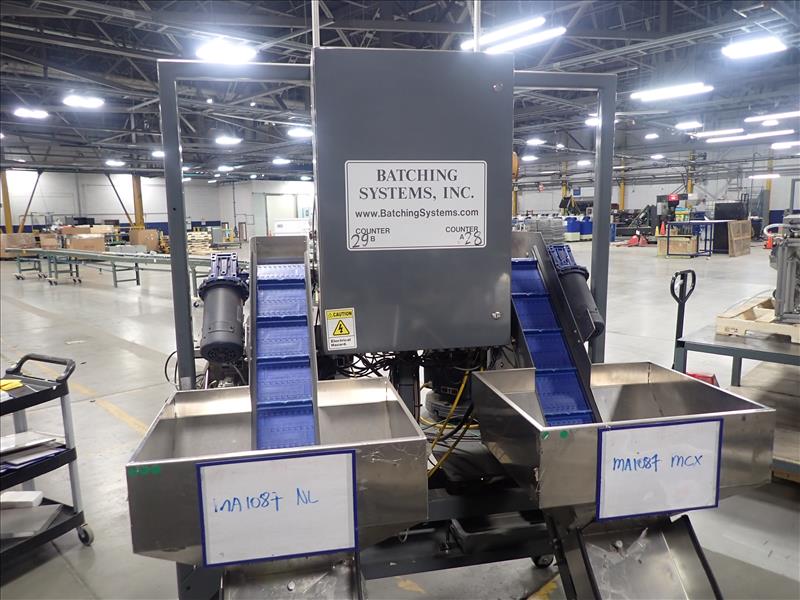Batching Systems Inc. dual continuous counter, mod. BATCHMASTER IV DELUXE, ser. no. BMIV-N-DA-063 w/ dual view scanners, dual fluted belt infeed conveyor, dual 24 in. vibratory bowl feeders, dual GATEBUDDY's, touch-screen controller and adj. hydraulic stand on casters