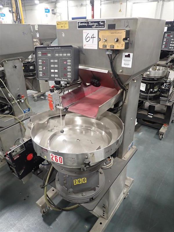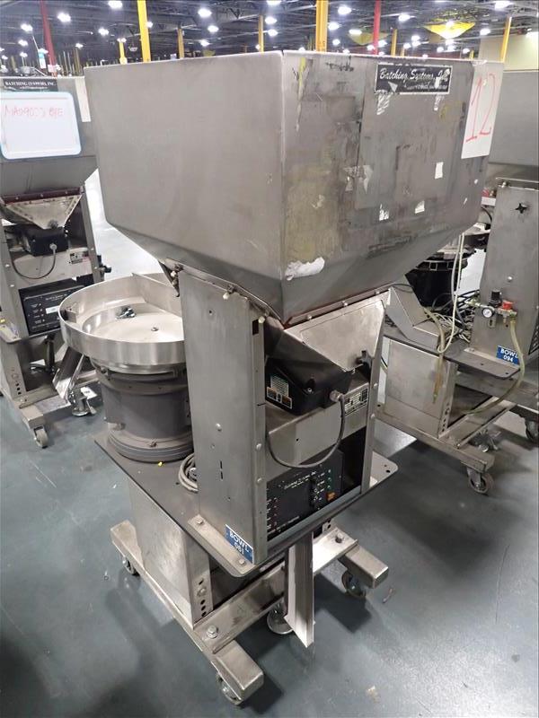 Batching Systems Inc. continuous counter, mod. BATCHMASTER II w/ 2D view scanners, 22 in. vibratory bowl feeder, controller on casters