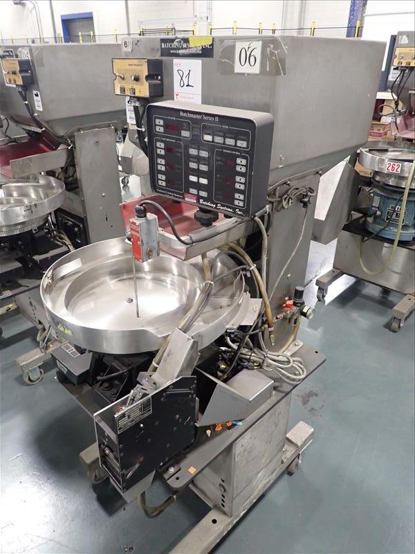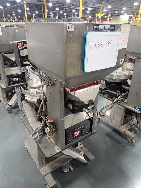 Batching Systems Inc. continuous counter, mod. BATCHMASTER II w/ 2D view scanners, 22 in. vibratory bowl feeder, controller on casters