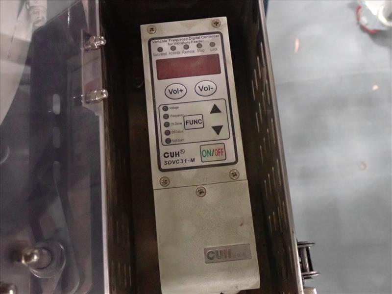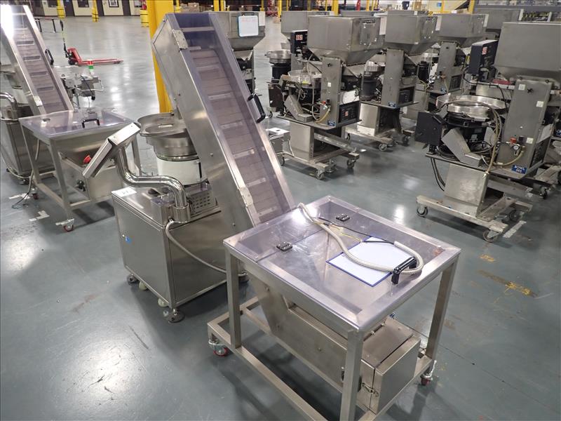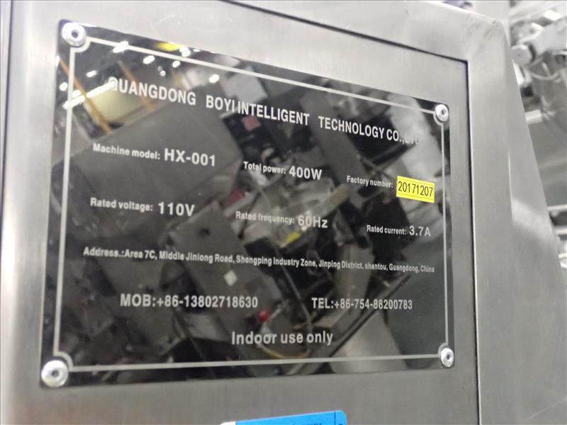 Guangdong Boyi Intelligent Tech Ltd. continuous counter, mod. HX-001 w/ laser scanner, 17 in. vibratory bowl feeder, Weinview touch-screen controller on casters c/w integrated hopper/feeder, 7.5 in. fluted belt