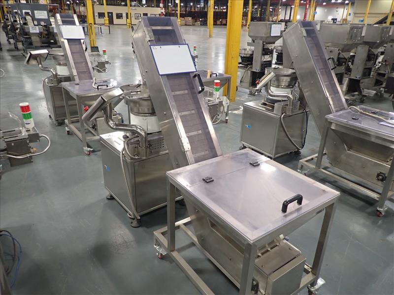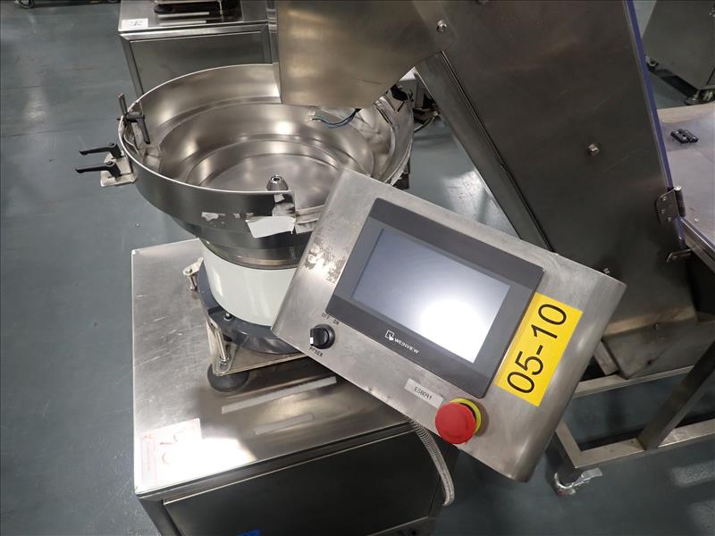 Guangdong Boyi Intelligent Tech Ltd. continuous counter, mod. HX-001 w/ laser scanner, 17 in. vibratory bowl feeder, Weinview touch-screen controller on casters c/w integrated hopper/feeder, 7.5 in. fluted belt