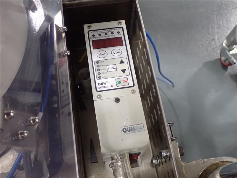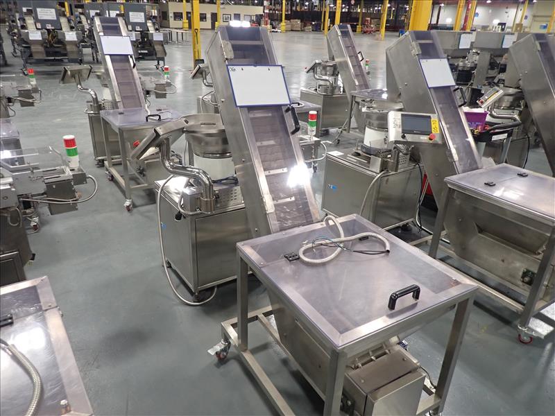 Guangdong Boyi Intelligent Tech Ltd. continuous counter, mod. HX-001 w/ laser scanner, 17 in. vibratory bowl feeder, Weinview touch-screen controller on casters c/w integrated hopper/feeder, 7.5 in. fluted belt