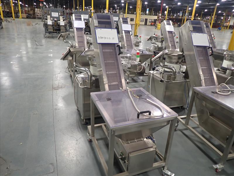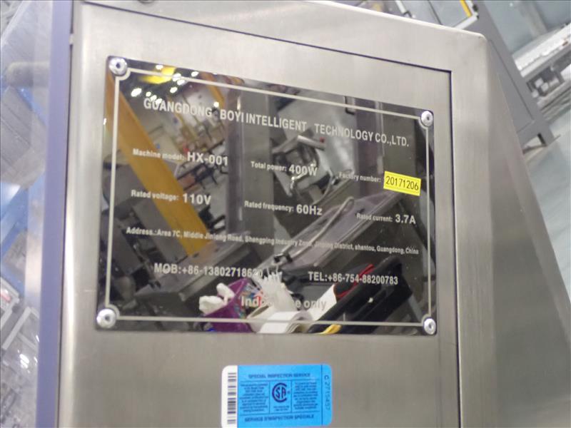 Guangdong Boyi Intelligent Tech Ltd. continuous counter, mod. HX-001 w/ laser scanner, 17 in. vibratory bowl feeder, Weinview touch-screen controller on casters c/w integrated hopper/feeder, 7.5 in. fluted belt