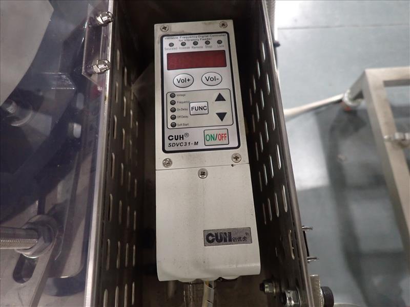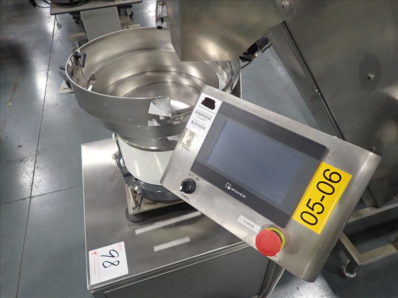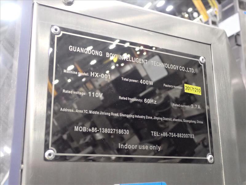 Guangdong Boyi Intelligent Tech Ltd. continuous counter, mod. HX-001 w/ laser scanner, 17 in. vibratory bowl feeder, Weinview touch-screen controller on casters c/w integrated hopper/feeder, 7.5 in. fluted belt