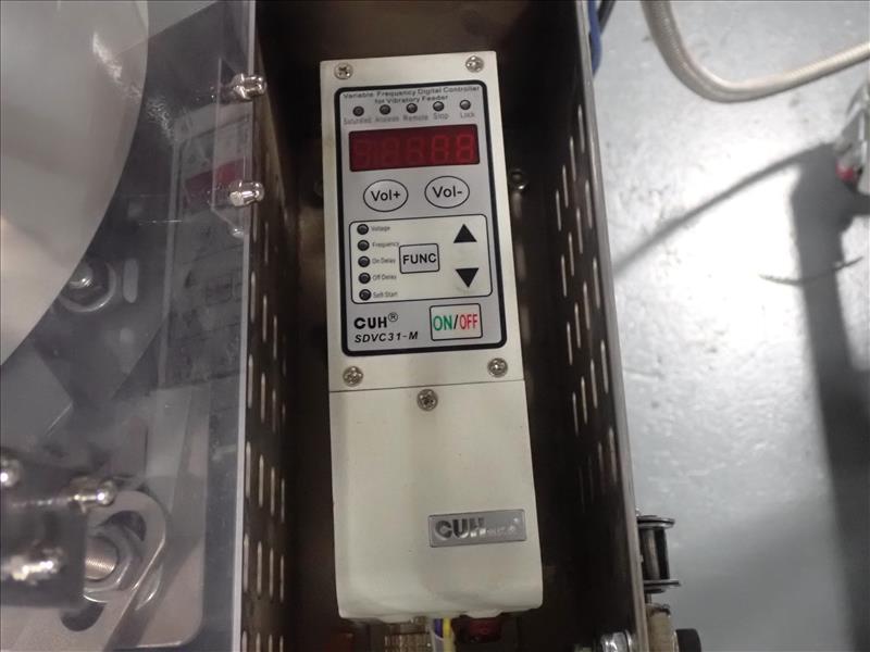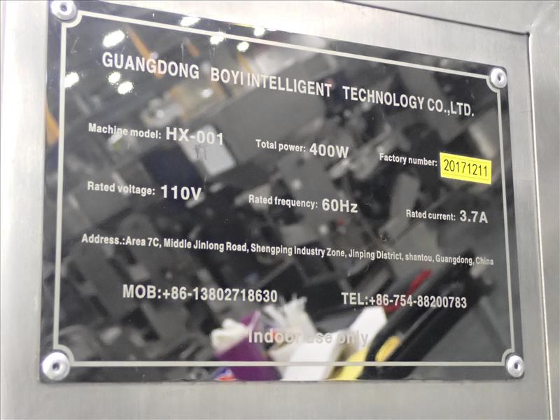 Guangdong Boyi Intelligent Tech Ltd. continuous counter, mod. HX-001 w/ laser scanner, 17 in. vibratory bowl feeder, Weinview touch-screen controller on casters c/w integrated hopper/feeder, 7.5 in. fluted belt