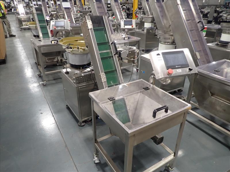continuous counter w/ laser scanner, 17 in. vibratory bowl feeder, touch-screen controller on casters c/w integrated hopper/feeder, 6 in. fluted belt