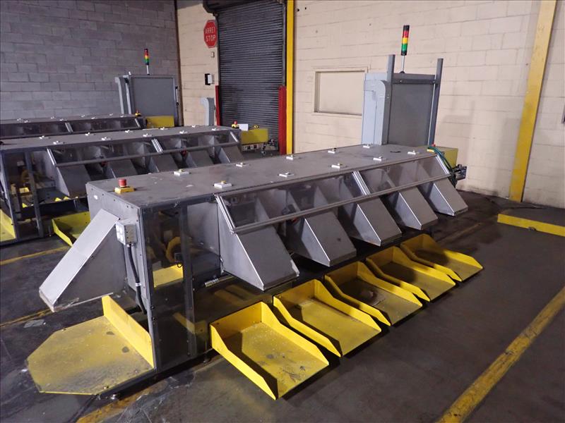conveyorized sorting station, 12 in. x 12 ft belt w/ 10-station w/ kickers, control panel w/ Omron touch-screen controller
