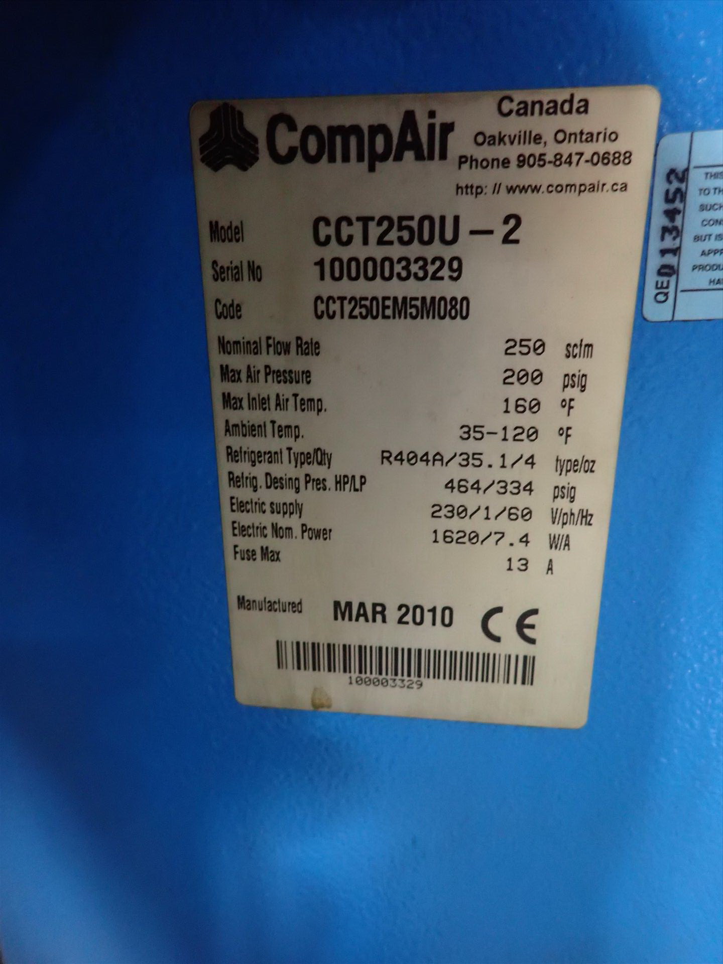 Compare air dryer, mod. CCT250V-2, ser. No. 10003329