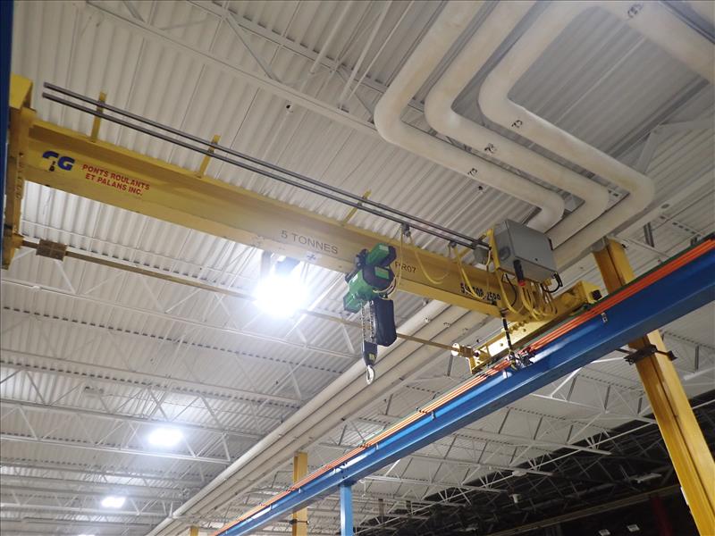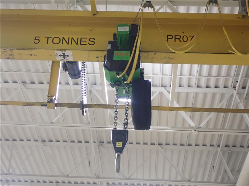 CG bridge crane, 5-ton w/ RWM 5-ton chain hoist, 42 ft spread, 96 ft run