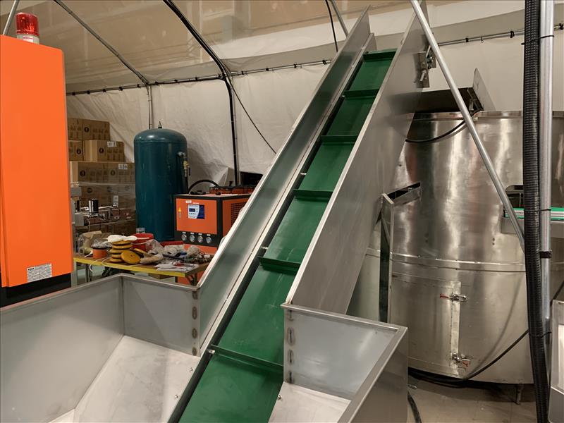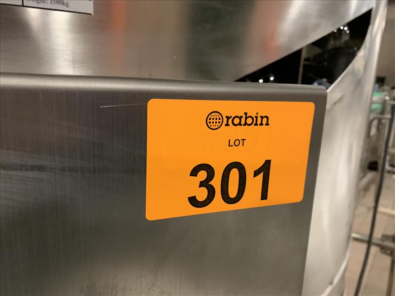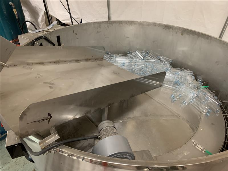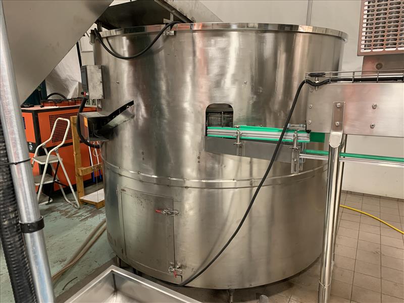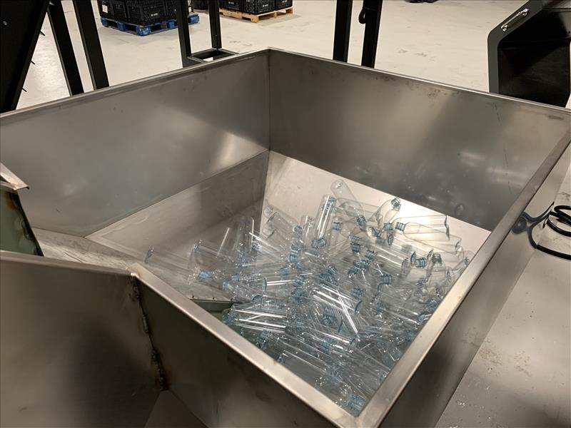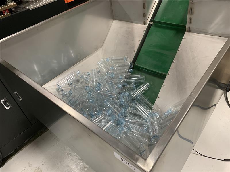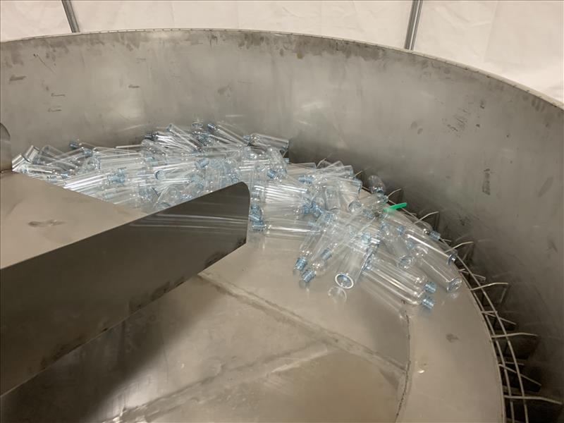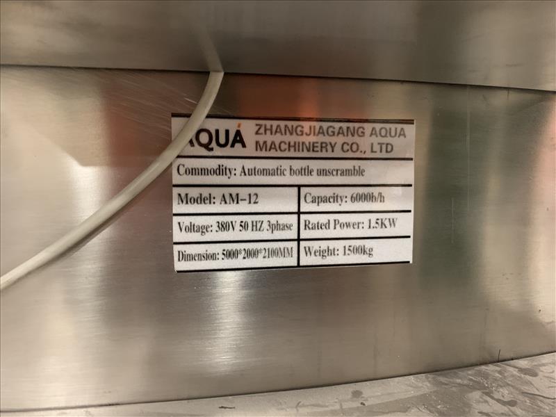 Zhangjiagang Aqua Machinery Co. Bottle Unscrambler, model AM-12, Rated for 6000 bottles per hr capacity, 380V, 50HZ, 3 phase, rated power 1.5KW, Weight: 1500 kg., overall dimension: 5000 x 2000 x 2100 mm dimensions, with bottle hopper ( 45 1/2\" x 45 1/2\", 4' high) and inclined feed conveyor (10' x 13\") 104\" high (2018) [SUBJECT TO CONFIRMATION]