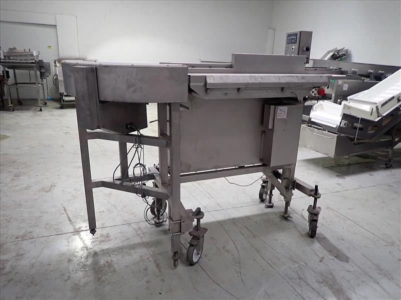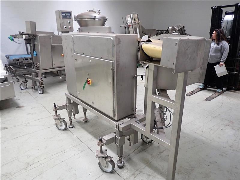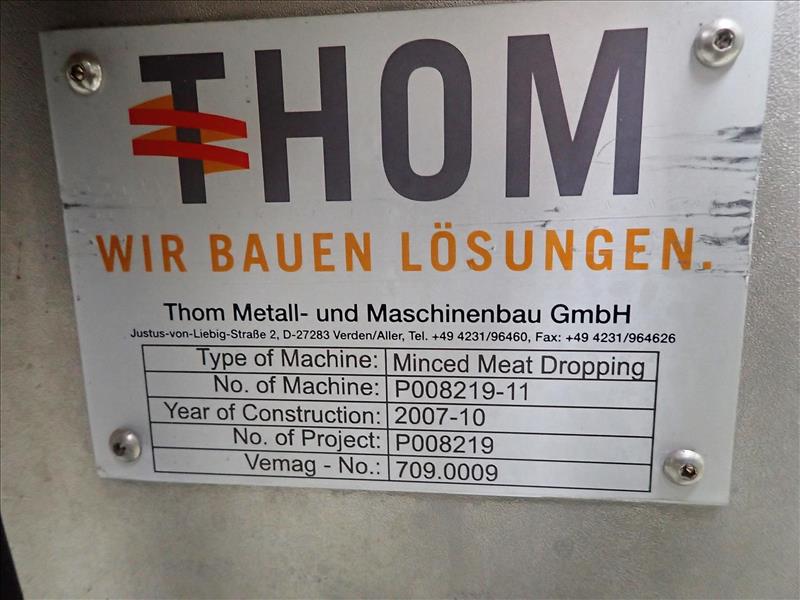 THOM minced meat dropper, mod. P008219-10, ser. no. 7090008, 90 deg. Outfeed belt conveyor