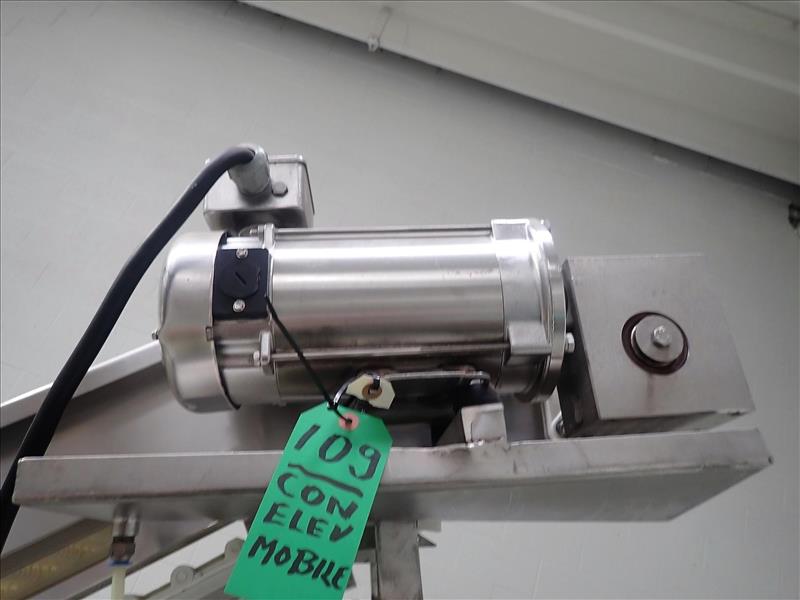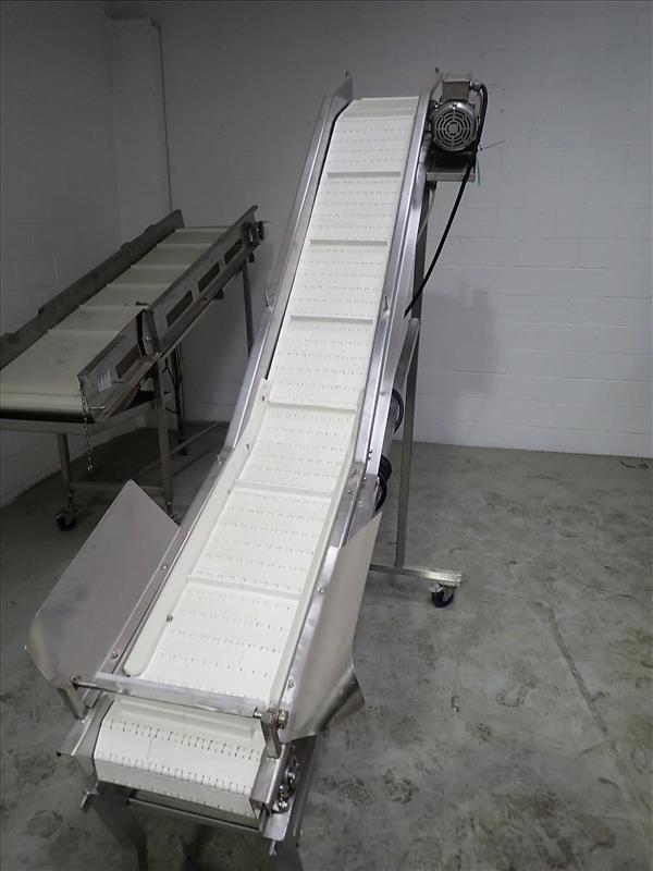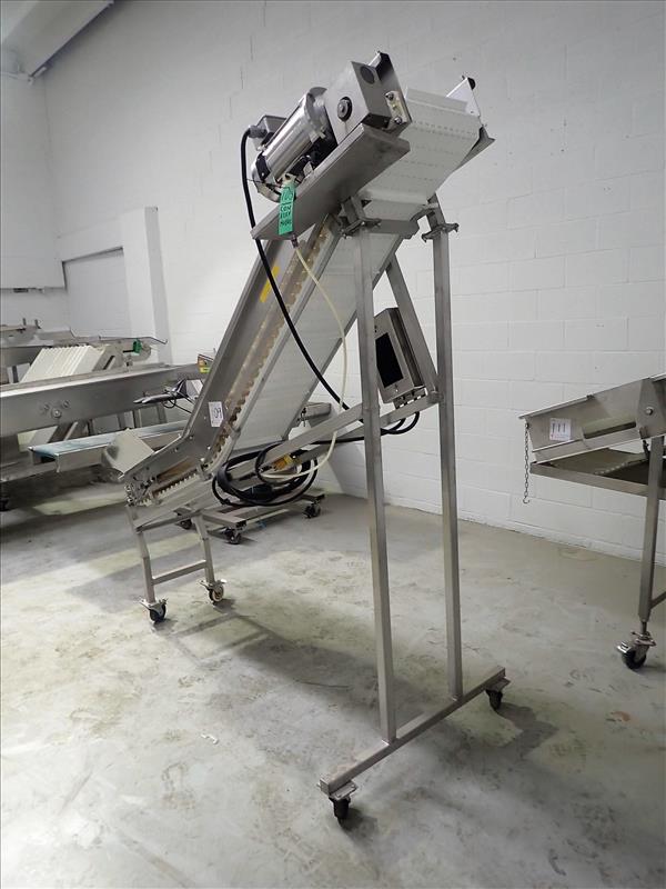 SolutionsInox inclined conveyor, s/s, 10 in. x 93 in. fluted belt, wash-down motor, VSD w/ casters