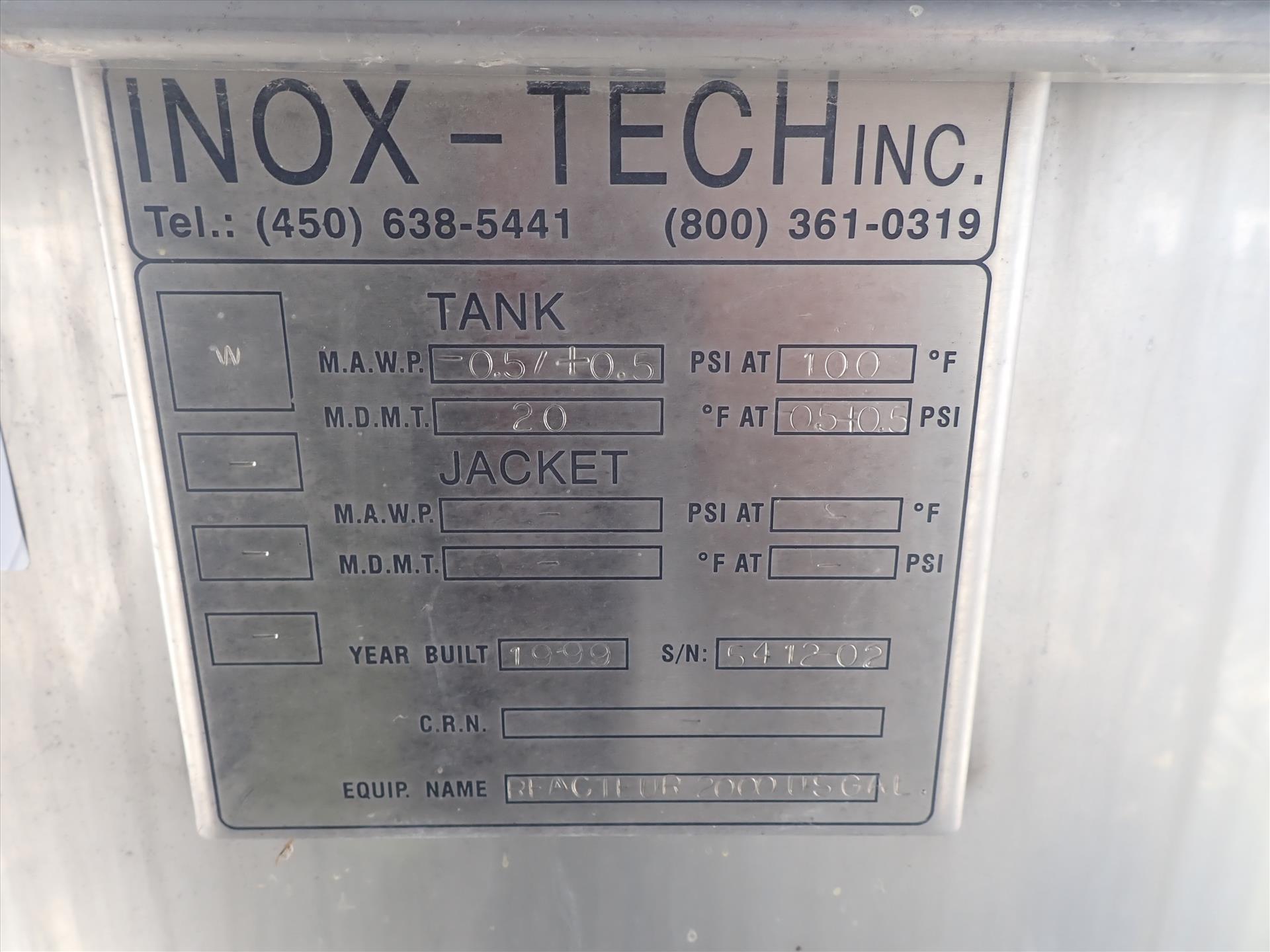 Inox-Tech Stainless Steel Tank, mod. Reacteur2000, ser. no. 5412-02, approx. 2000 gal.