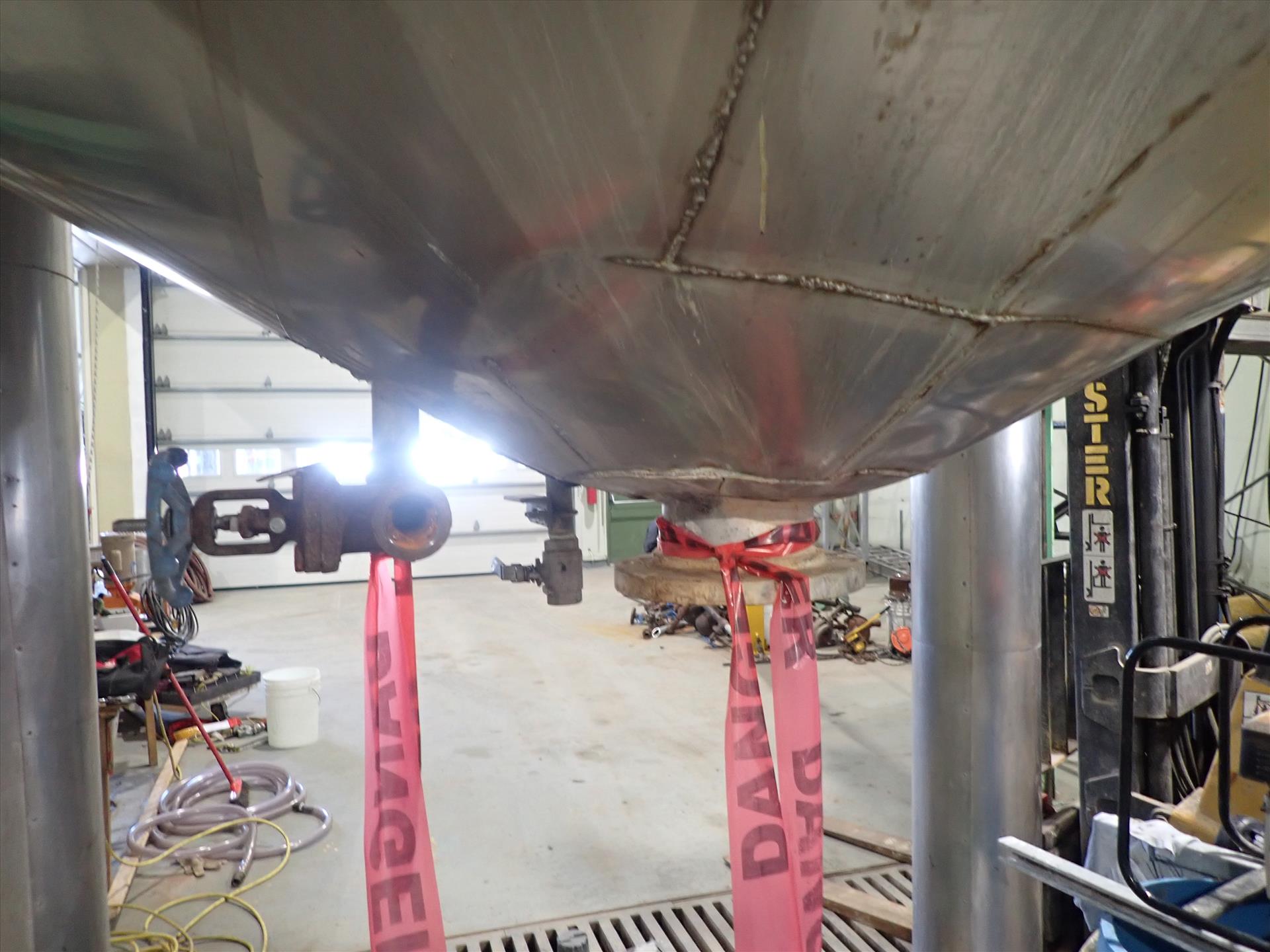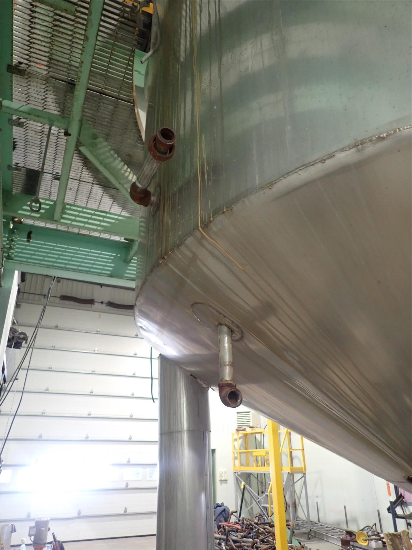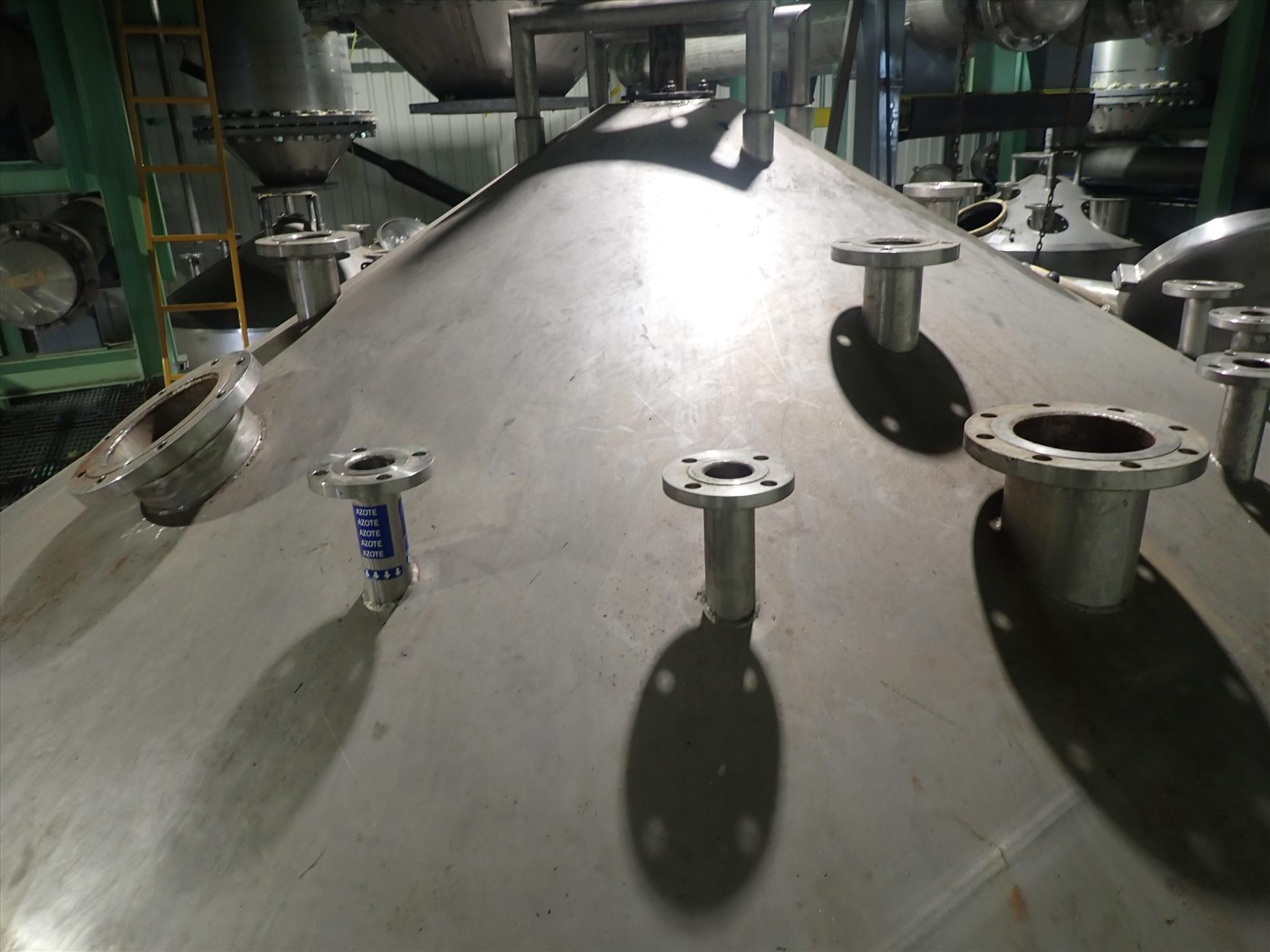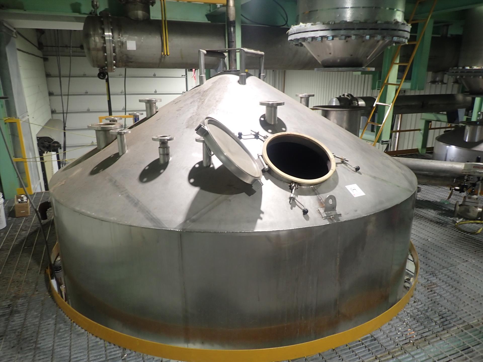 Inox-Tech Jacketed Tank 5400 gal., Stainless Steel, vertical. Internal rated 15 psi at 130 degrees F, jacket rated 150 psi at 400 degrees F. Top entering agitator with gearmotor, coned top and bottom, ser. no. 5376, built 1999. Mounted (4) legs w/ load cells.