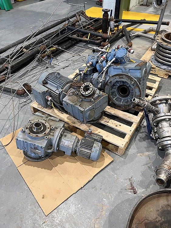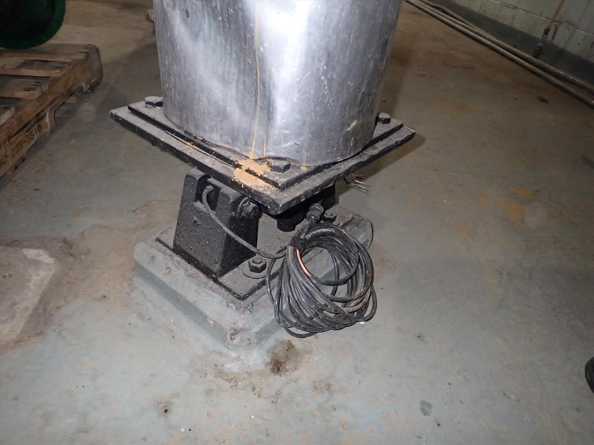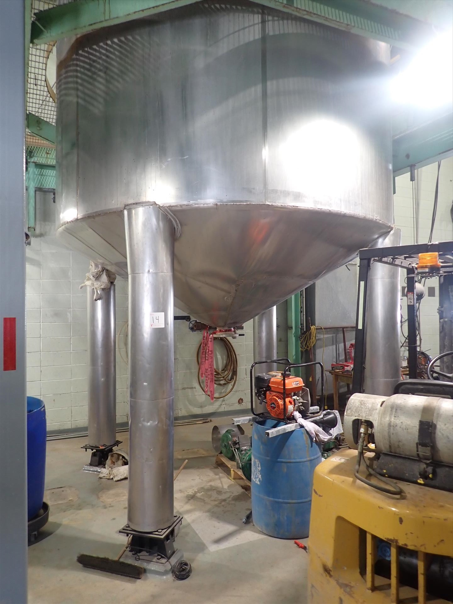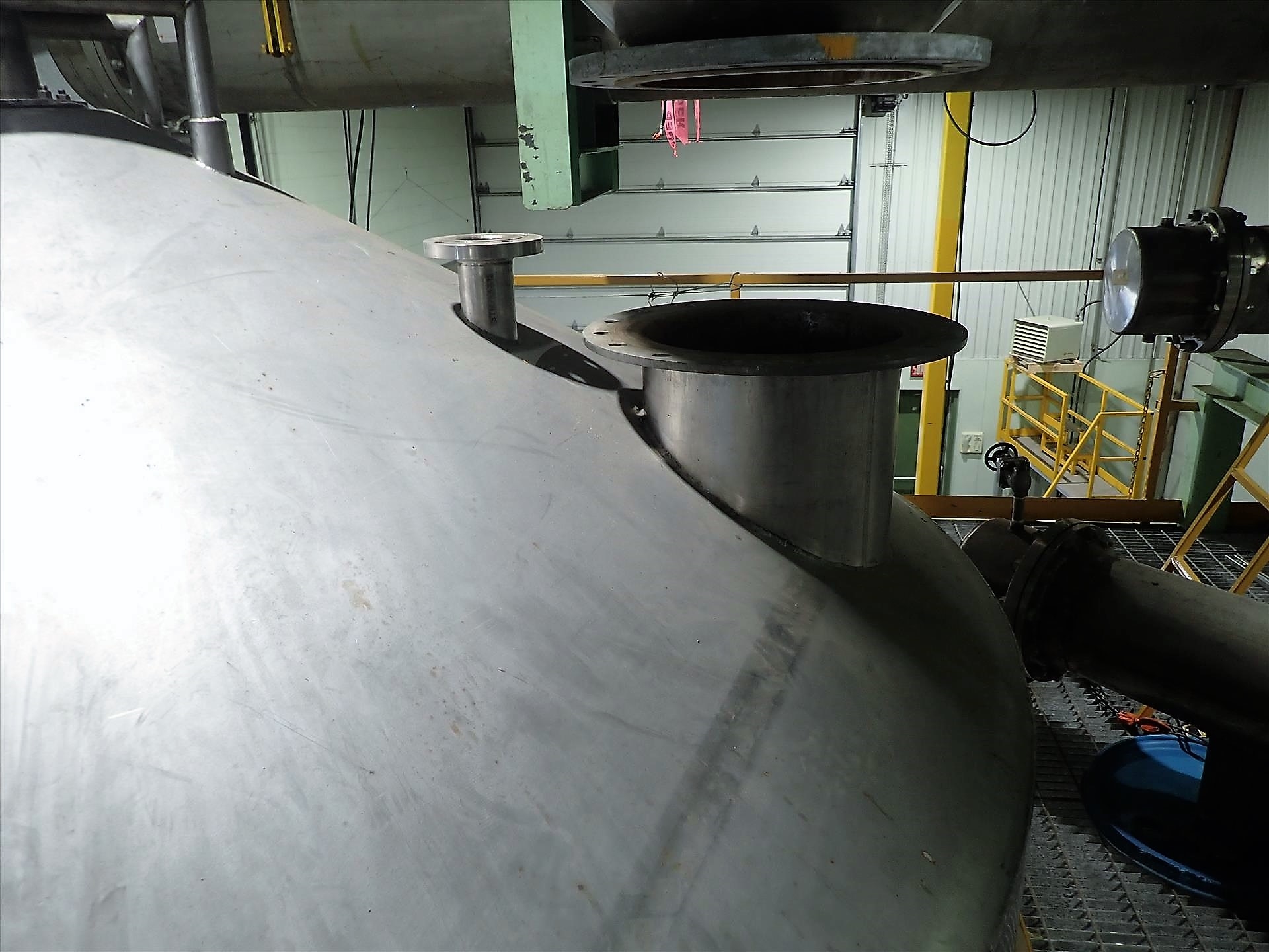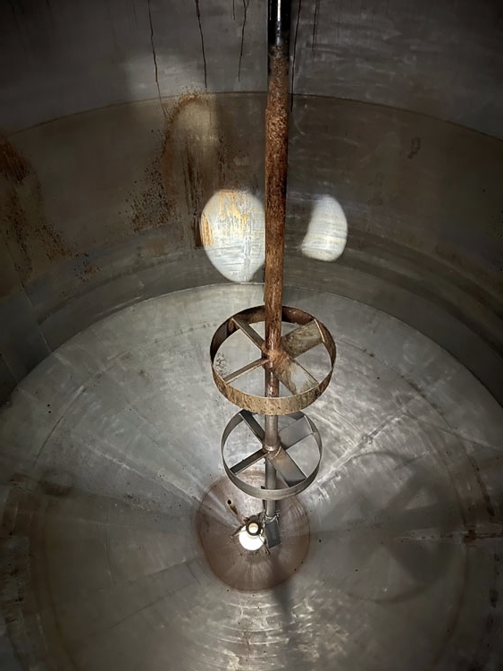 Inox-Tech Jacketed Tank 5400 gal., Stainless Steel, vertical. Internal rated 15 psi at 130 degrees F, jacket rated 150 psi at 400 degrees F. Top entering agitator with gearmotor, coned top and bottom, ser. no. 5376, built 1999. Mounted (4) legs w/ load cells.