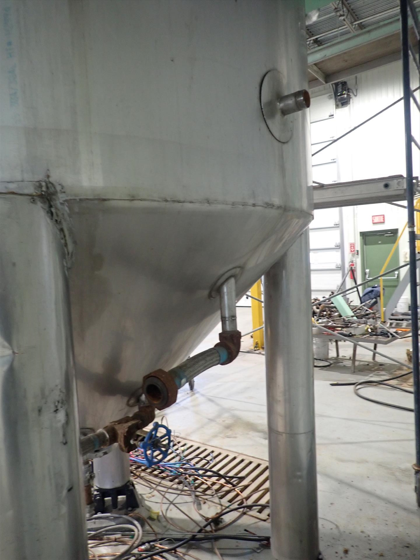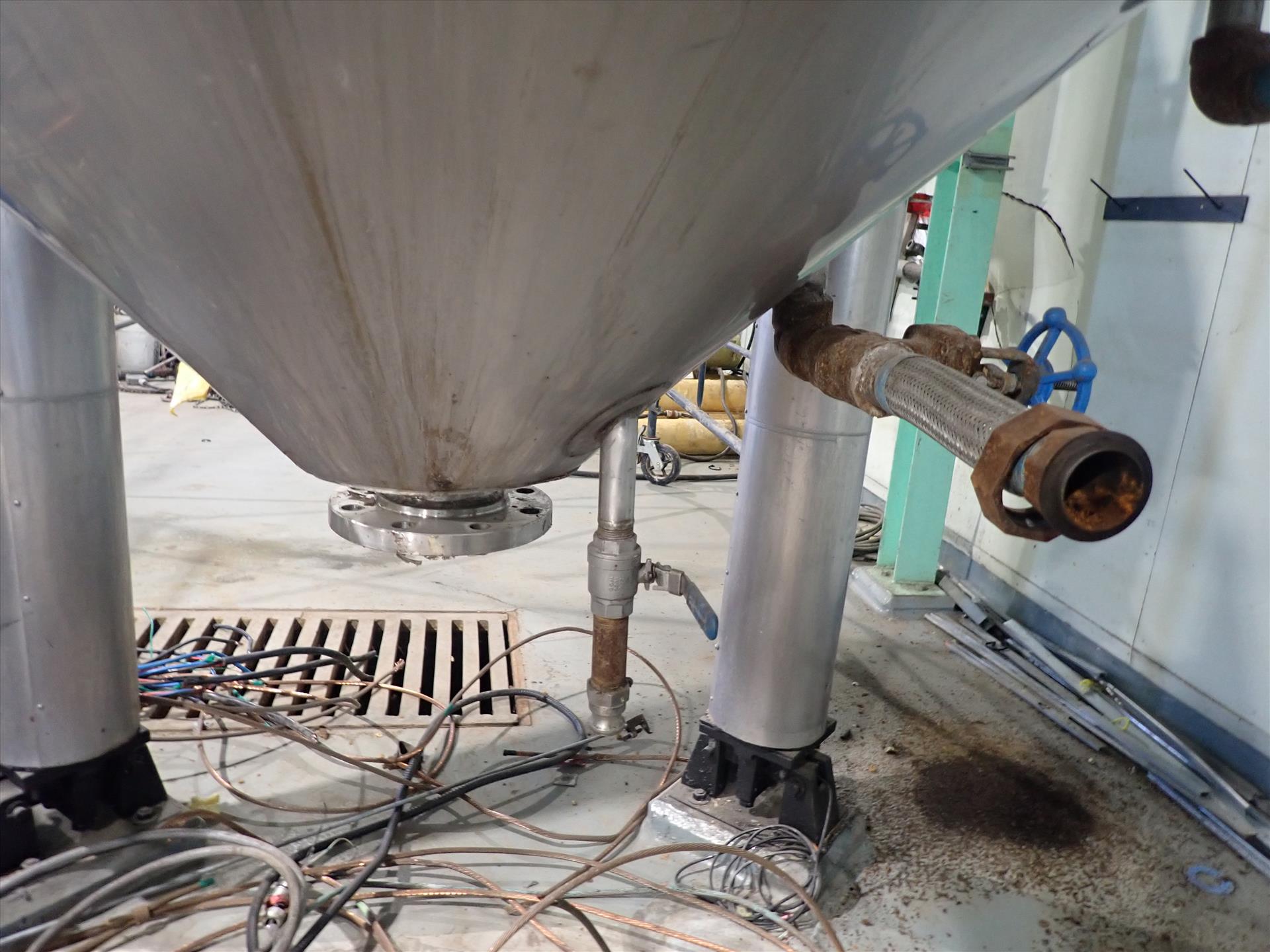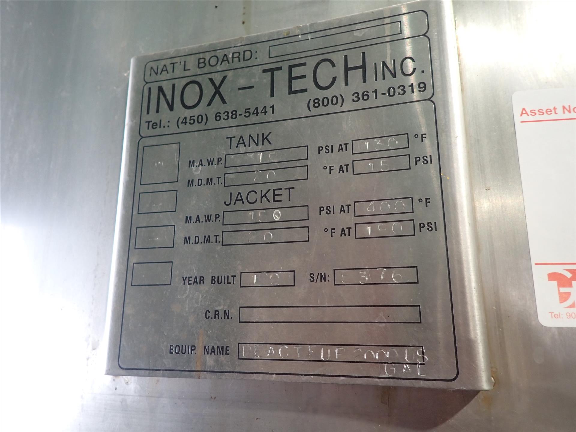 Inox-Tech Jacketed Tank, 2000 gal., Stainless Steel, Vertical. Internal rated 15 psi at 130 degrees F, jacket rated 150 psi at 400 degrees F. Top entering agitator with gearmotor, coned top and bottom. NO MFG TAG. Mounted (4) legs w/ load cells.