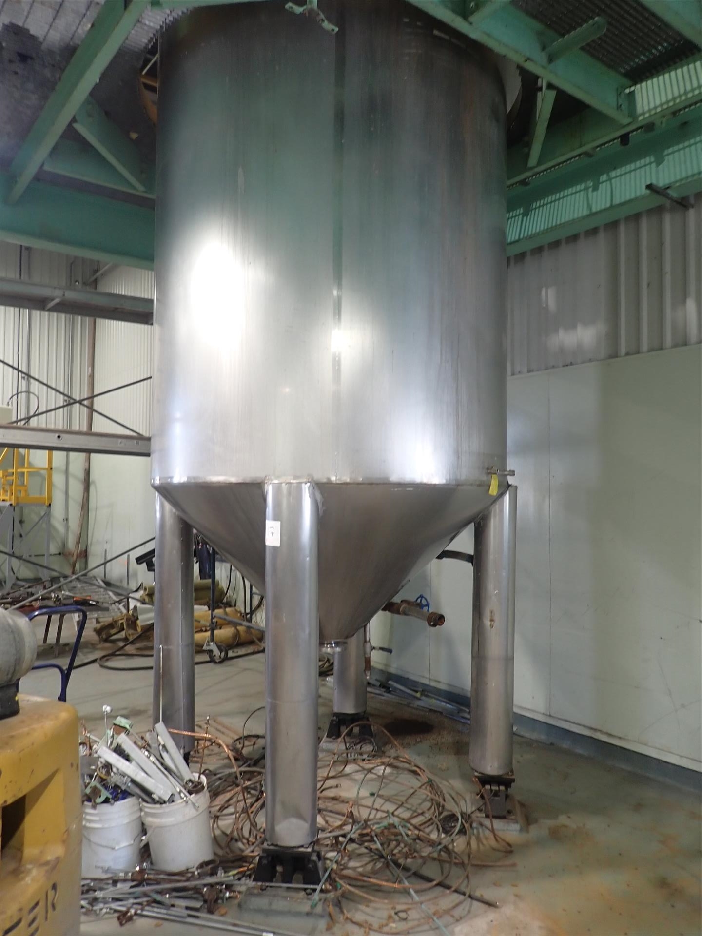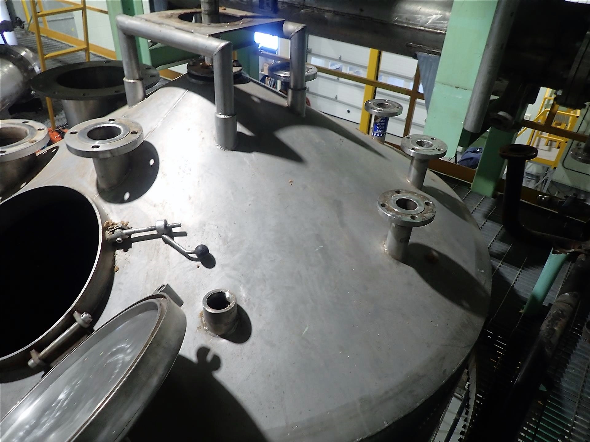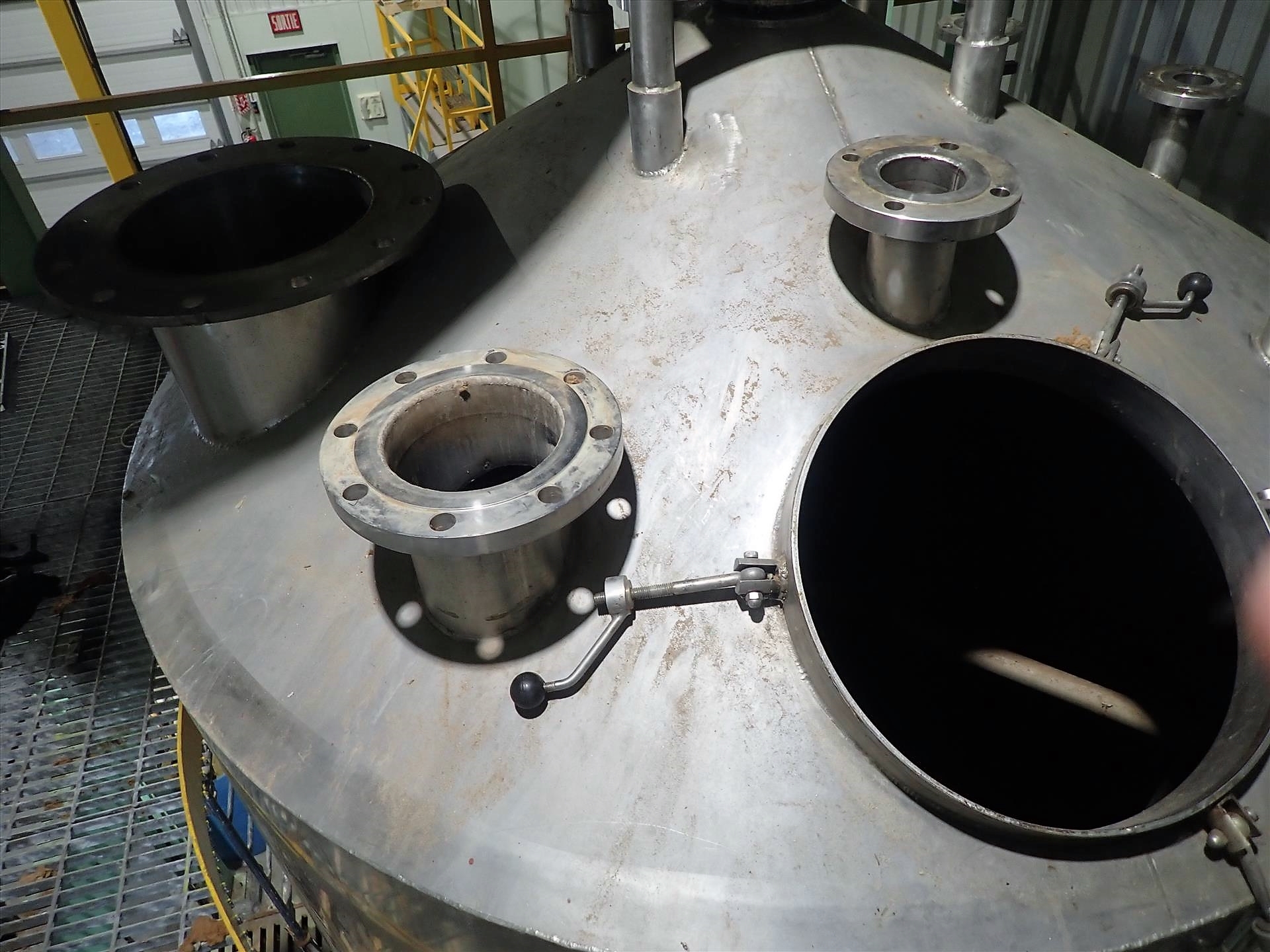 Inox-Tech Jacketed Tank, 2000 gal., Stainless Steel, Vertical. Internal rated 15 psi at 130 degrees F, jacket rated 150 psi at 400 degrees F. Top entering agitator with gearmotor, coned top and bottom. NO MFG TAG. Mounted (4) legs w/ load cells.