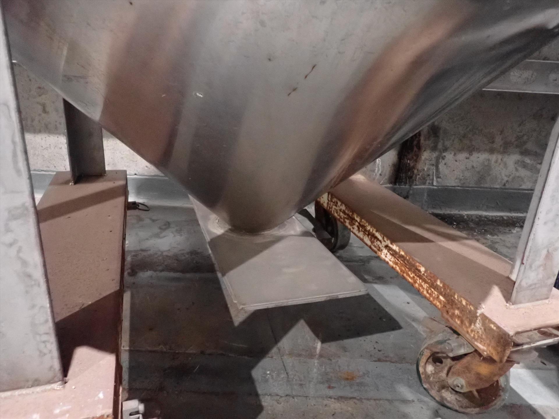 Stainless Steel Tank/Hopper, cone bottom, bottom discharge, approx. 40 in. dia. x 36 in. on casters