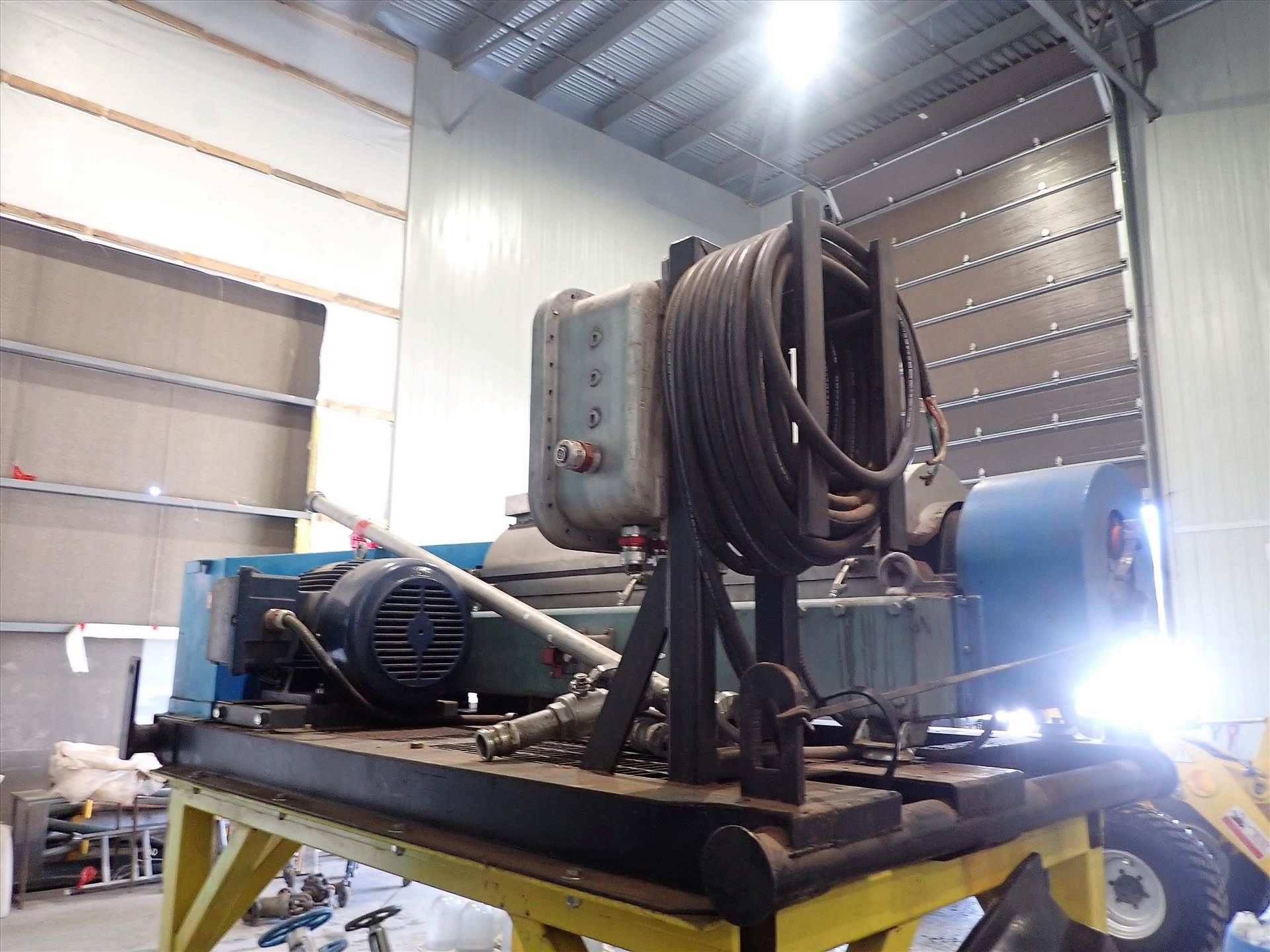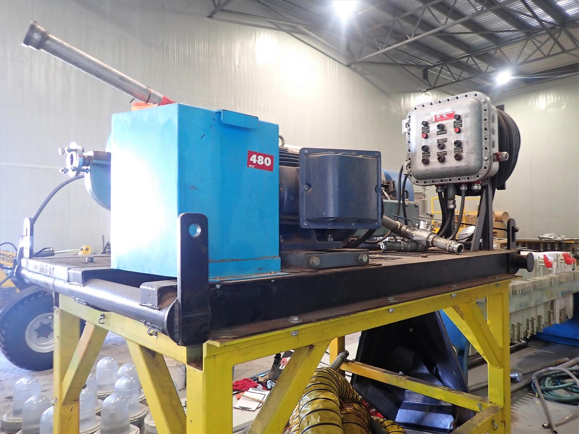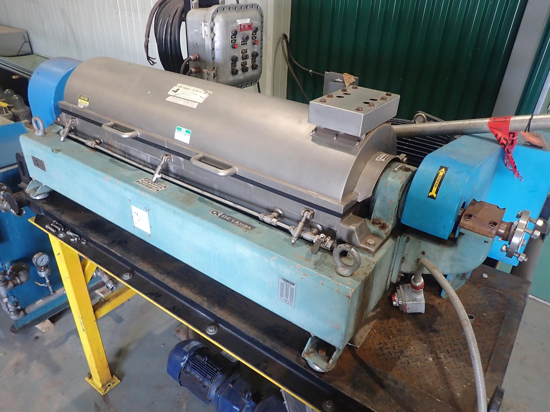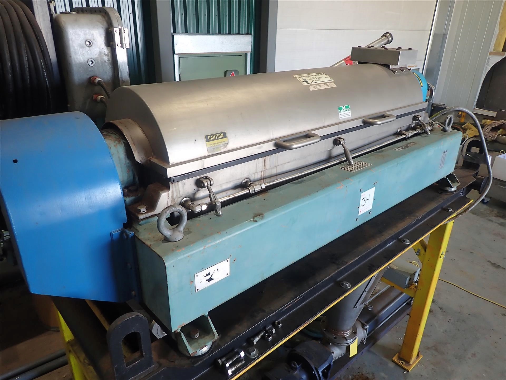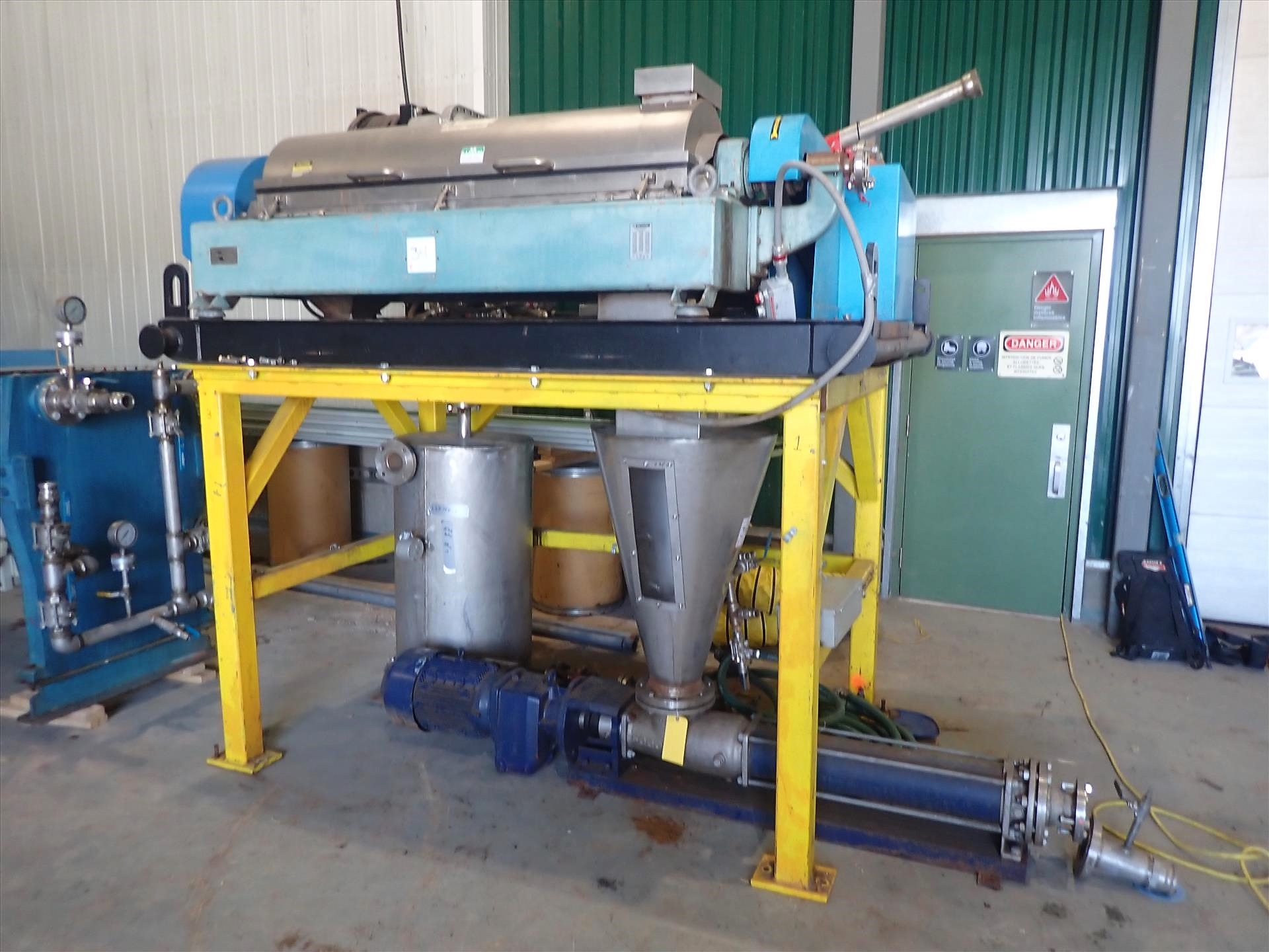 Alfa Laval AVNx418 Decanter Centrifuge. 3250 rpm, on stand, xP control box. ser. no. 2991104, 40 hp c/w powered exit auger conveyor, s/s hopper, s/s tank