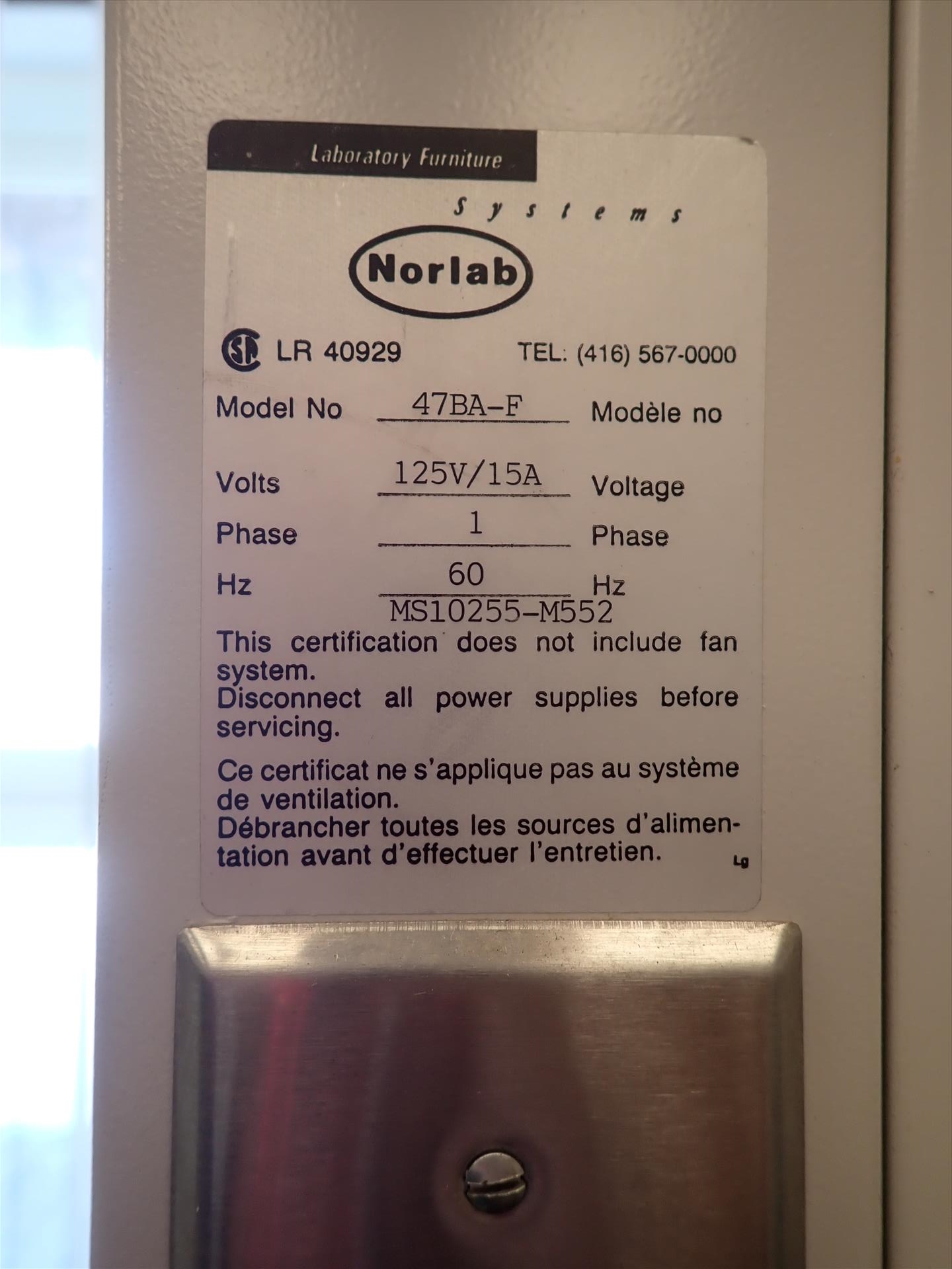Norlab fume laboratory hood, mod. 47BA-F, ser. no. MS10255-M552, 37 in.