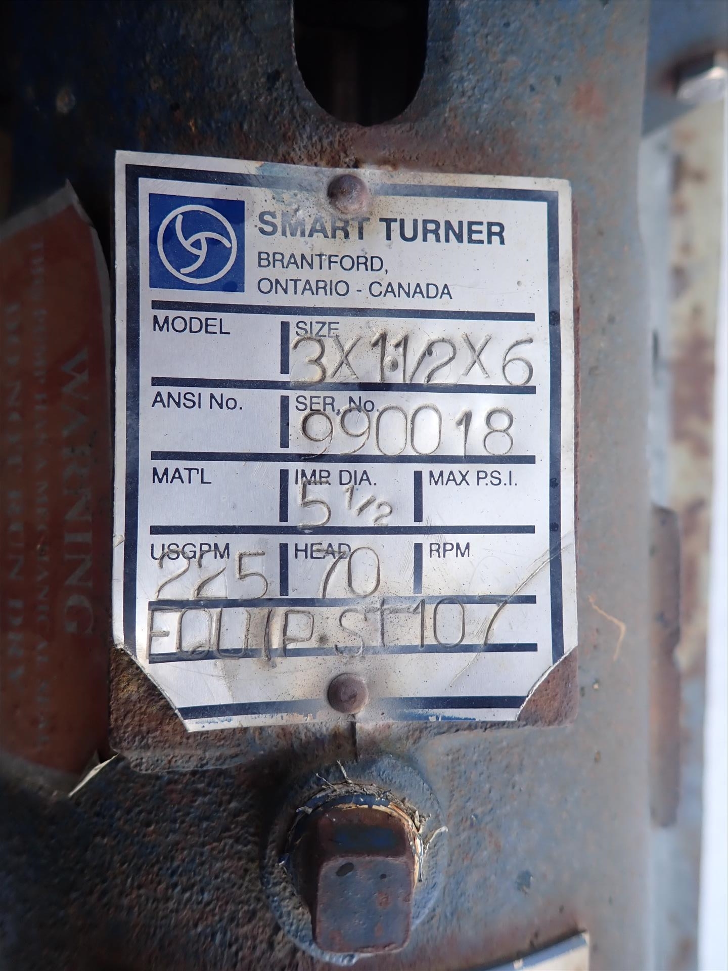 SmartTurner Centrifugal Pump, mod. 3 x 1.5 x 6, ser. no. 990018, 5.5 dia., head 70, 225 USGPM, 5 hp