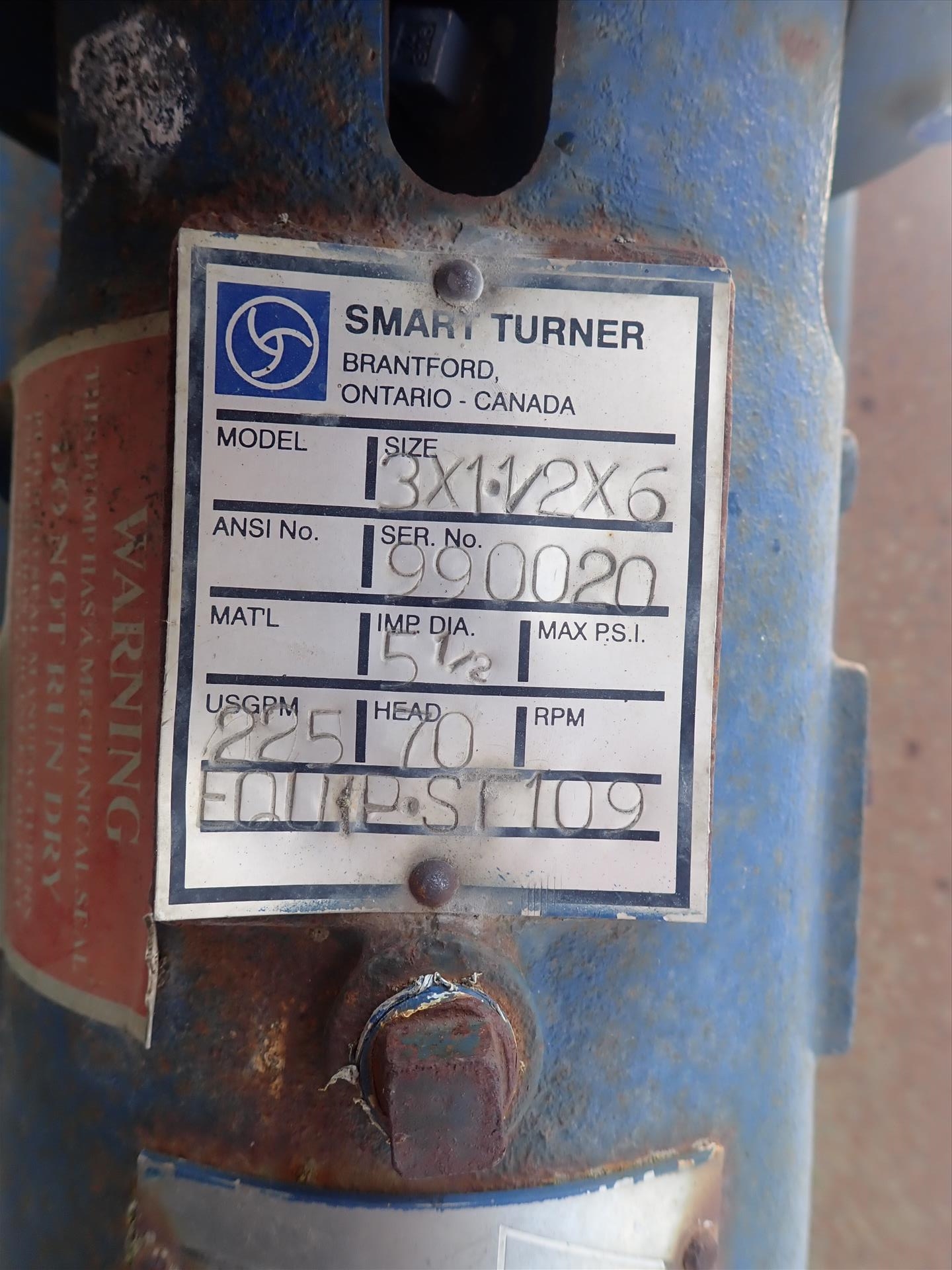 SmartTurner Centrifugal Pump, mod. 3 x 1.5 x 6, ser. no. 990020, 5.5 dia., head 70, 225 USGPM, 5 hp