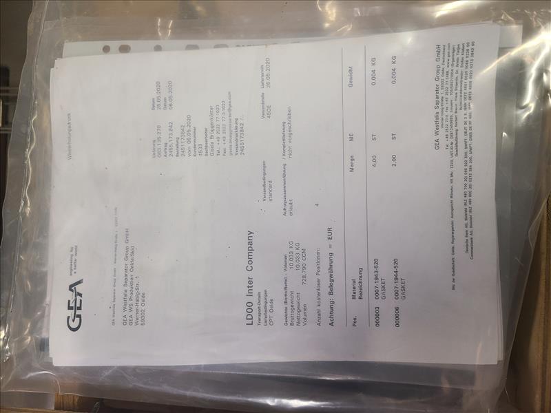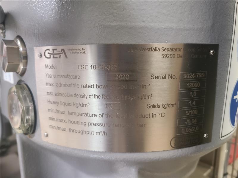 GEA Westfalia solid bowl disc centrifuge, mfg. 2020, model FSE-10-06-077, s/n 9024-795, stainless steel construction (product contact areas), max bowl speed 12000 rpm, clarifier design (liquid/solids separation), centripetal pump liquid discharge, direct drive, 7.5 hp drive motor, 460/3/60, outboard control system with PLC and VFD, and spare tools (Subject to Confirmation) [Asset located in Vaughan, Ontario]
