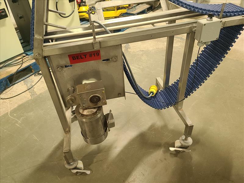 Lift-up power conveyor, s/s, plastic belt, approx. 6 in. x 6 ft., 3/4 hp wash-down motor, casters